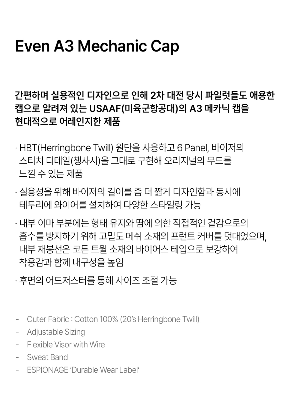 에스피오나지(ESPIONAGE)는 '밖을 보다' '숨겨져 있는 것을 발견한다'는 의미의 고대 프랑스어 ESPIRE에서 유래한 말로 지금은 타국의 비밀 정보를 수집하는 첩보 활동을 뜻하기도 합니다. 첩보 활동의 의미가 적진에서 은밀히 적들의 정보를 빼오는 것을 말하는 것처럼 에스피오나지가 만드는 아이템에는 숨겨져 있는 것을 찾아내는 과정을 포함하고 있습니다. 클래식, 밀리터리, 아웃도어 등 이미 만들어져 있는 의복을 베이스로 우리가 중요하게 생각하는 원단과 부자재, 기술, 핏 등의 요소들을 정확하게 탐구하고 수집해 조합, 재정의 혹은 재해석된 결과물을 만들고자 합니다. 사전적인 의미의 에스피오나지가 가지는 부정적인 첩보 활동의 이미지가 아닌 첩보 활동의 과정, 즉 본질에 대한 탐구와 조사 활동이라는 긍정적인 느낌을 전달하려 하며 수집된 정보를 하나의 작업물로 만들어내는 일련의 과정과 그렇게 완성한 에스피오나지의 아이템을 통해 다시 만드는 과정을 다시 유추하려는 생각들 모두 에스피오나지입니다.