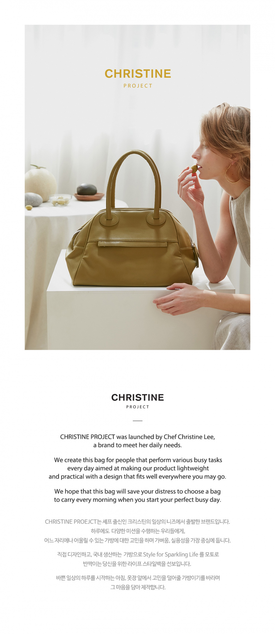 크리스틴프로젝트(CHRISTINE PROJECT)는 셰프 출신 디자이너 크리스틴의 일상에서 영감을 받은 브랜드입니다. 음식을 디자인하고 플레이팅 하듯 섬세한 디테일과 공정으로 가볍고 실용적인 가방을 제안합니다. 식재료에서 영감받은 감각적인 컬러와 독창적인 디자인으로, 편안함과 개성을 더해 일상을 더욱 스타일리시하게 완성할 디자인을 추구합니다.
