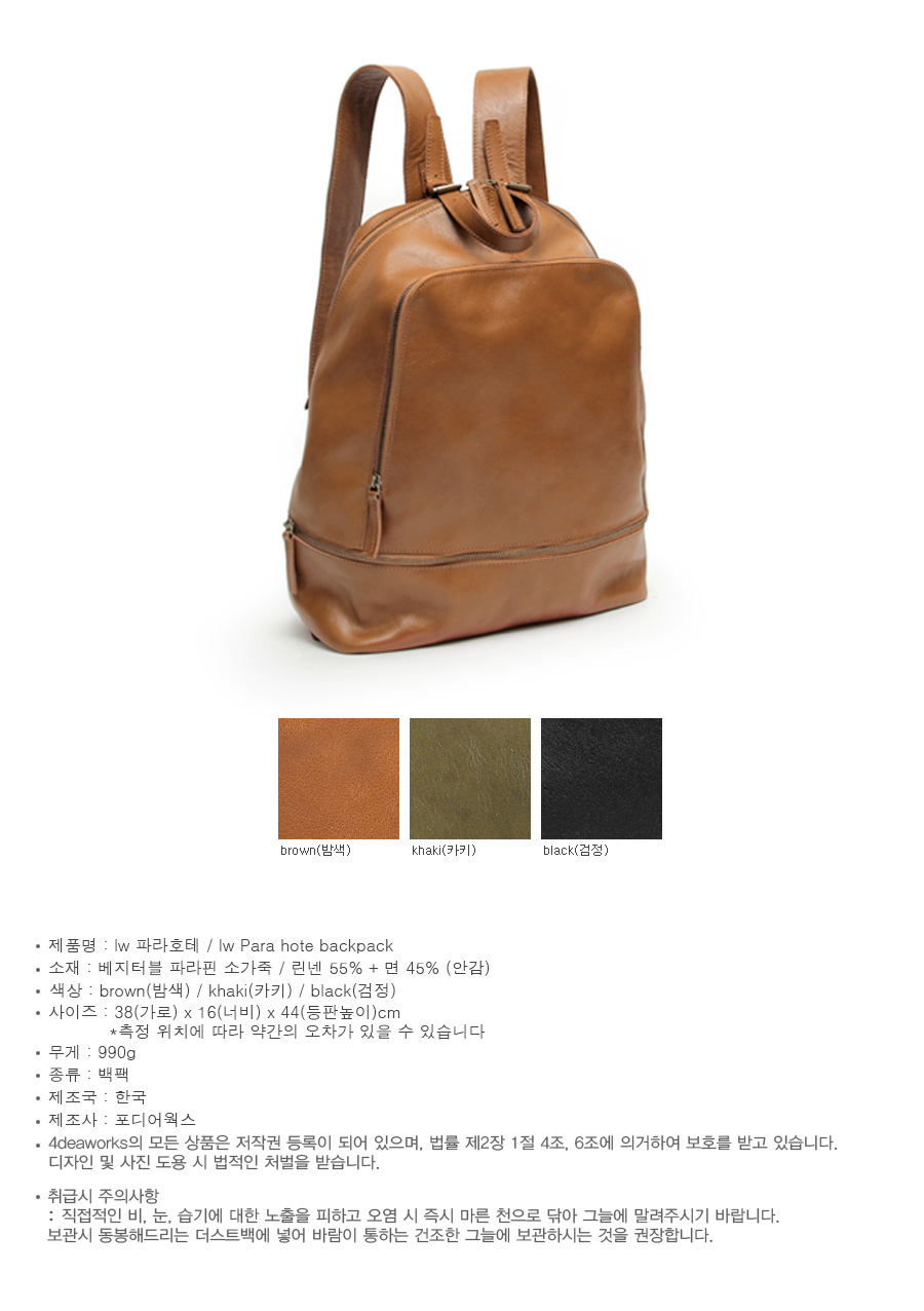 - 가죽이 들어간 제품 특성상 제품 공정시 발생하는 소량의 스크래치나 점, 주름 등은 교환 및 반품 사유가 되지 않습니다.