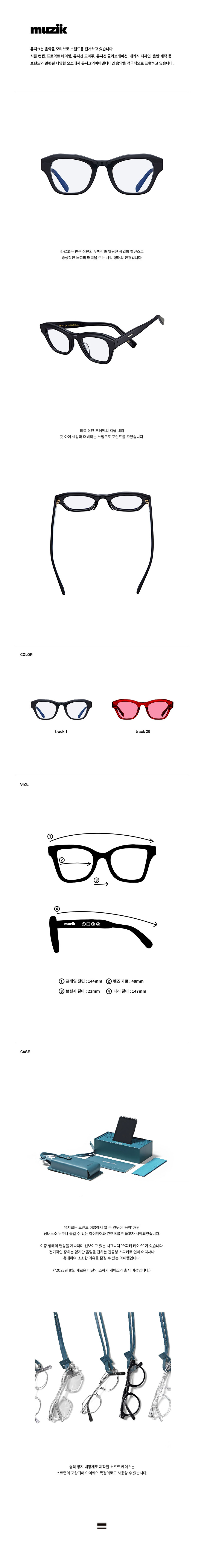 MUZIK(뮤지크)는 '음악(MUSIC)'이라는 흥미로운 소재를 모티브로국경, 세대, 문화, 성별을 넘어서 일상의 한 부분이 되는것을 목표로 합니다. 우리의 아이웨어는 수 많은 아이디어와 이야기를 공유할 수 있는 무제한적인 도구라고 생각하며 새로움에 역동적으로 도전하고자 합니다. 이런 뮤지크만의 색을 제품뿐 아니라 패키지, 아트웍, 콜라보레이션 등에 담아내겠습니다