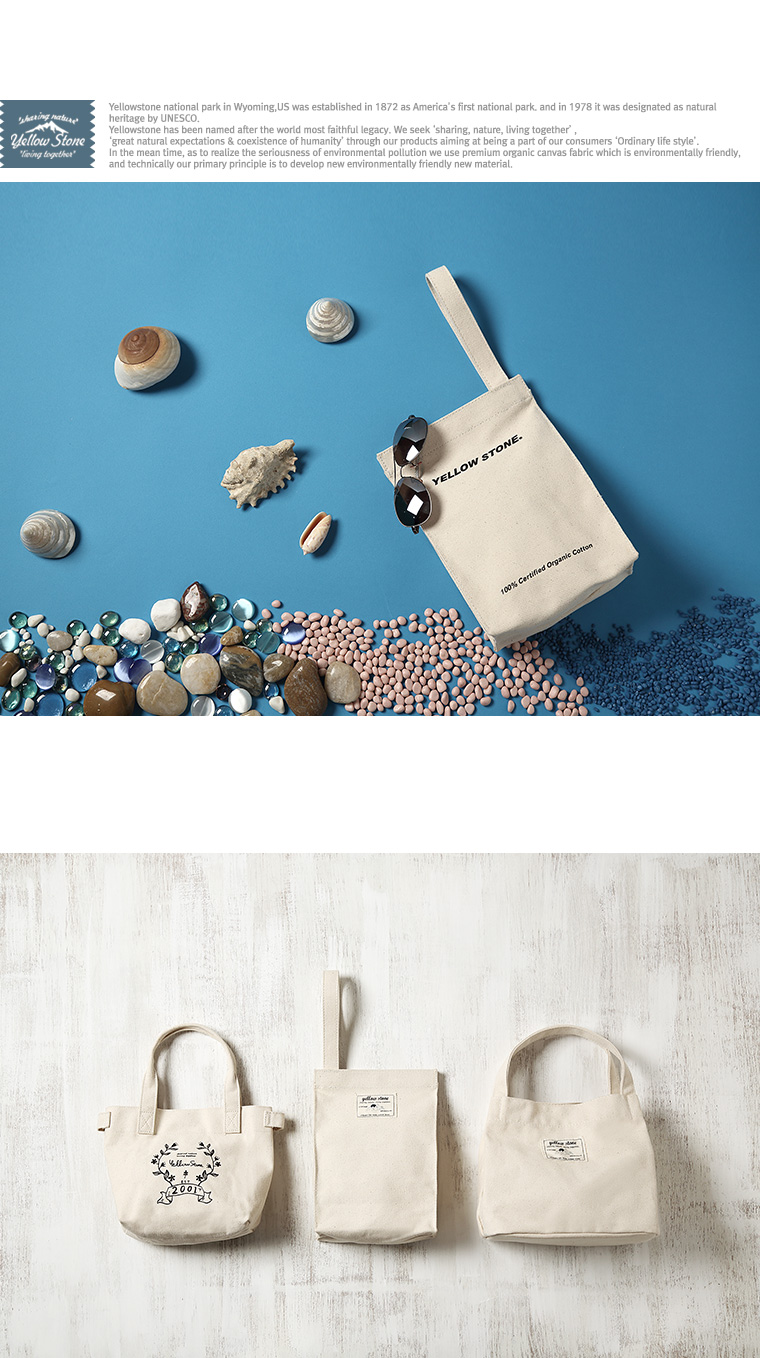 YELLOWSTONE(옐로우스톤)은 1892년, 미국 최초 국립공언으로 지정, 1978년 유네스코 자연유산으로 지정된 와이오밍 주에 속한 Yellowstone의 명칭으로부터 명명되었스며, '위대한 자연과 인간의 공존'이라는 의미를 부여한 , 'Sharing Nature, Living Together'라는 슬로건 아래, '네이처,어드벤처,빈티지;라는 테마와 함께 'Ordinary Life Style'을 지향합니다. 그리고 동시에 자연 환경 보존, 환경 오염에 심각성을 널리 알리고 개선하는데 동참하고자 친환경 최상금 Organic Canvas Fabric 중심으로 가급적 자연에 유해되지 않는 소재를 개발 및 사용하여 가방을 생산하고 있으며, 현재에도 그리고 앞으로도 늘 신소재 개발에 주안을 둘 것입니다.