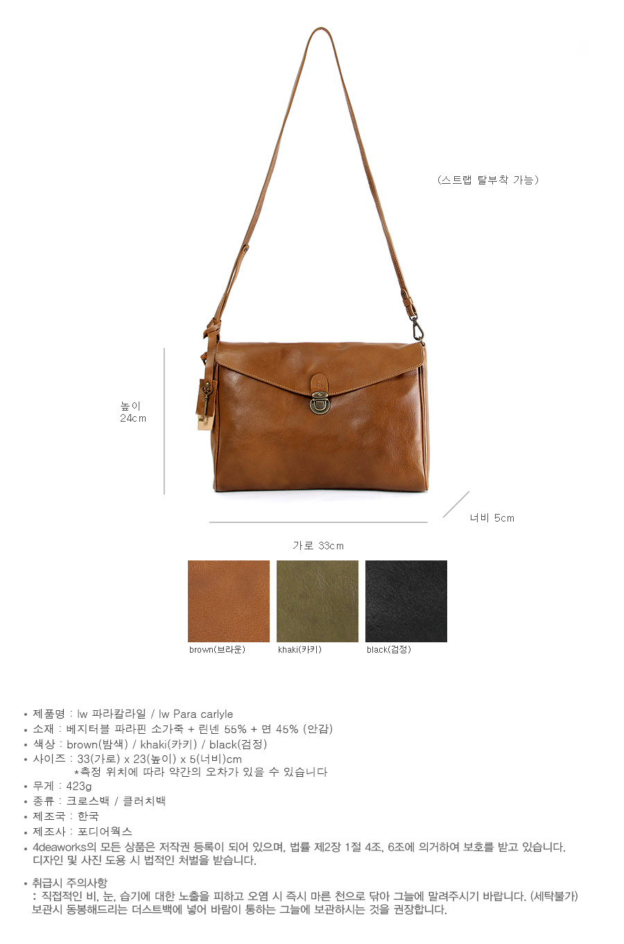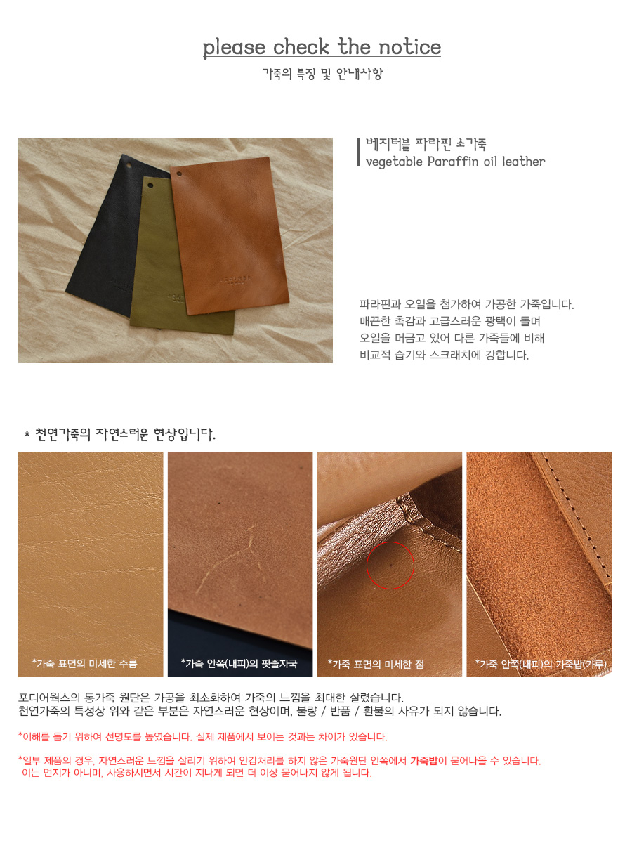 - 가죽이 들어간 제품 특성상 제품 공정시 발생하는 소량의 스크래치나 점, 주름 등은 교환 및 반품 사유가 되지 않습니다.