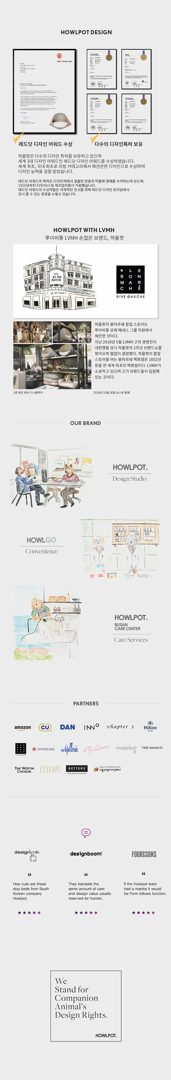 하울팟(HOWLPOT)은 반려동물의 디자인 권리를 지지하는 그룹입니다. 'Home Furnishing for Companion Animal’이라는 브랜드 컨셉트를 가지고 반려동물을 위한 소소한 배려를 담은 디자인을 하고 있습니다. 사람이 쓰는 제품과 동등한 디자인 가치를 적용하는 것을 최우선으로 생각해 애완동물의 용품이 아닌 반려동물 제품으로 하울팟의 물건을 만들고 있습니다.