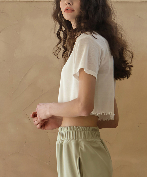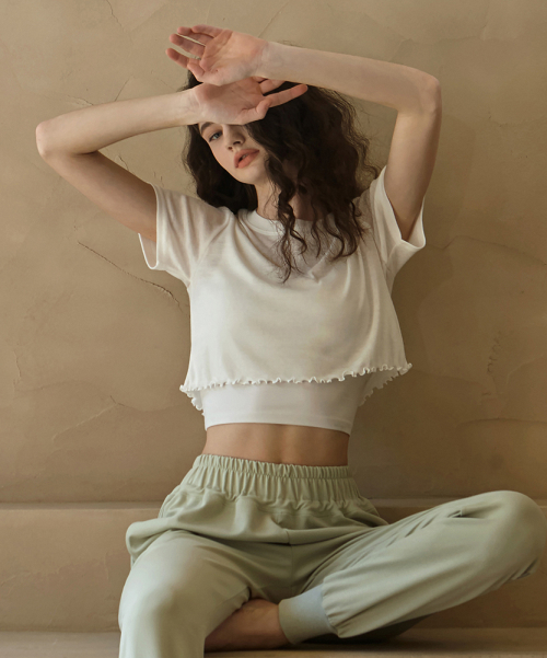 여성 요가복 DEVI-T0130-크림 필라테스 줄리 셔링 캡 슬리브