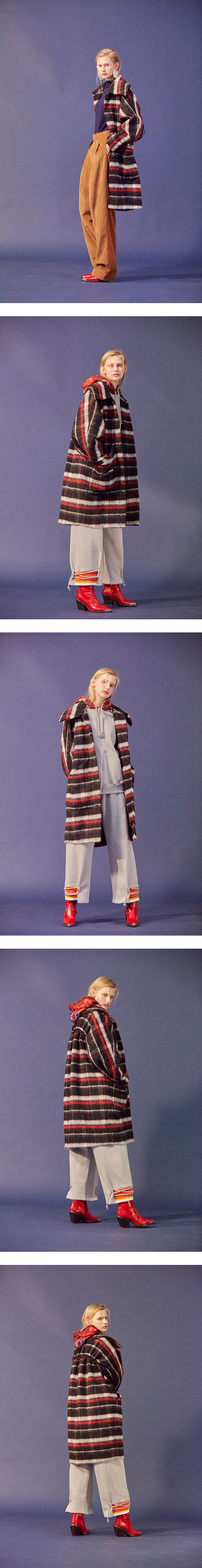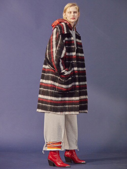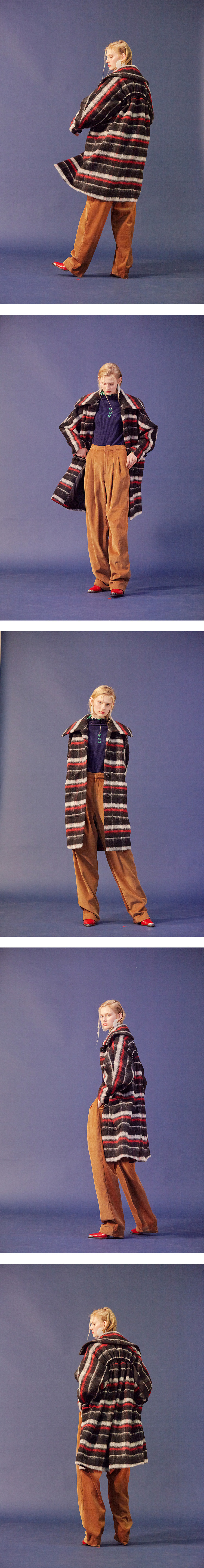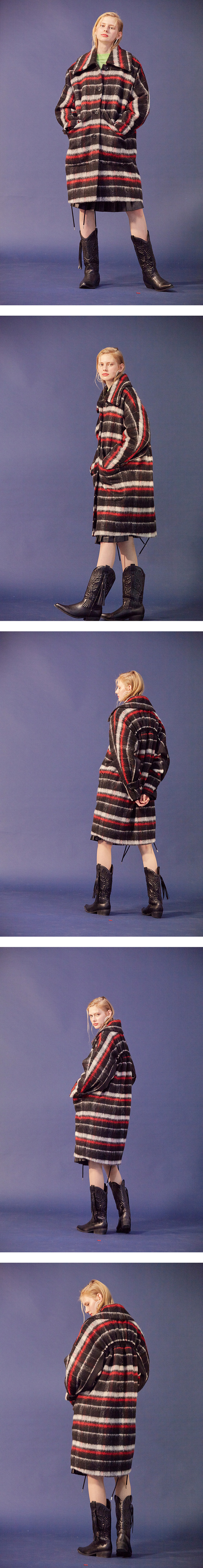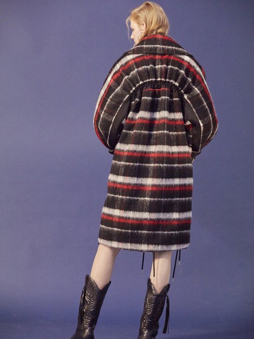 시즌 키 디테일인 백 러플 디테일이 심플하게 들어간 모헤어 울혼방 소재의 원단의 오버사이즈 롱 체크 코트.