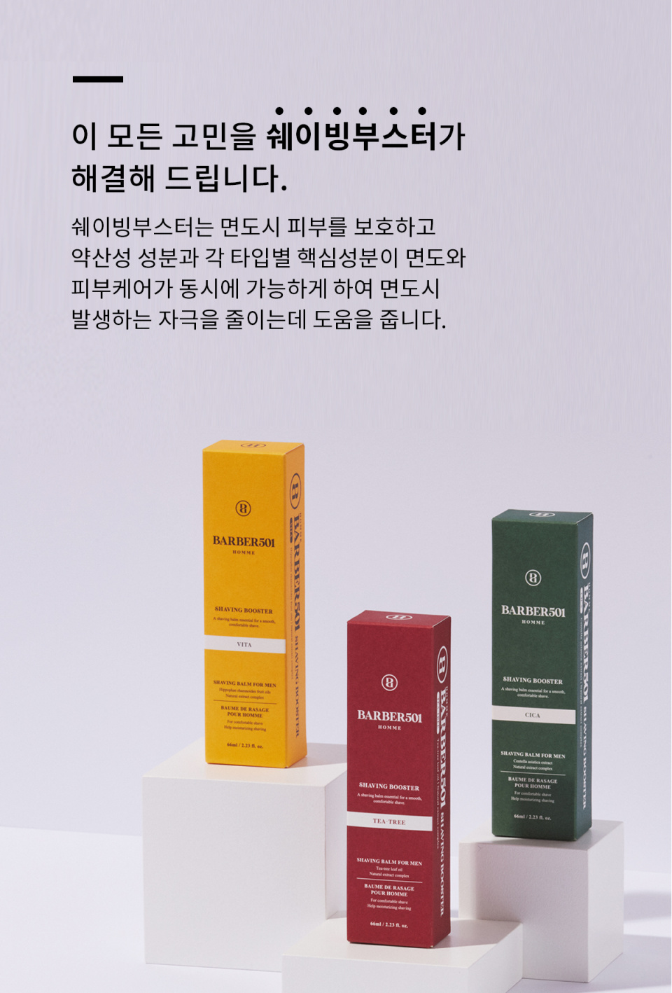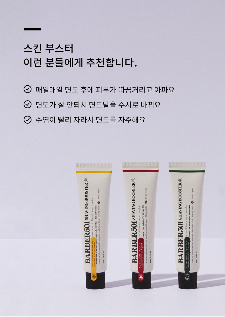 바버 501(BARBER 501)은 면도를 하게 되는 51%의 피부를 집중 보호하고 관리하는 특별한 쉐이빙 케어 브랜드입니다.