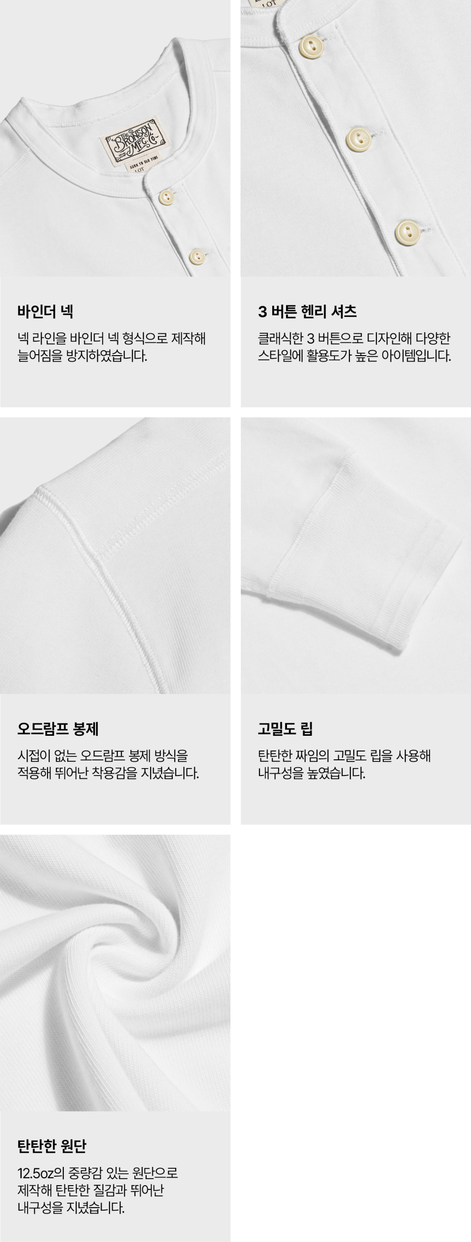브론슨(BRONSON)은 오랜 의복을 토대로 모던한 요소를 더해 완성하는 정통 캐주얼 웨어를 추구합니다. 밀리터리, 아웃도어, 워크웨어, 빈티지 스포츠웨어 등 1970~1980년의 아메리칸 클래식에서 영감을 얻어 데님, 밀리터리, 캐주얼 등 폭 넓은 라인업을 전개하고 있습니다. 특히 기본에 충실하며 오랜 시간이 지나도 변함없이 함께할 수 있는 아이템을 생산합니다.