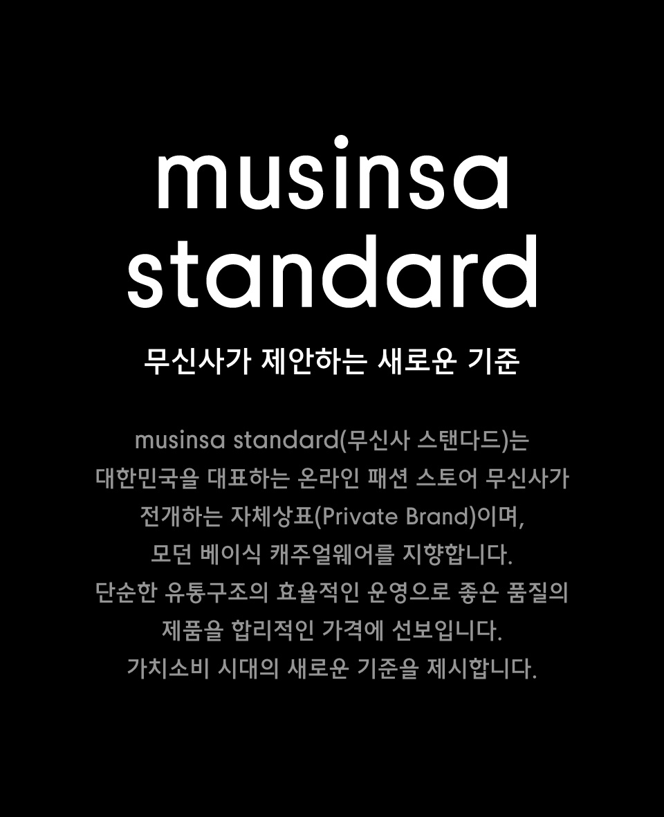 무신사 스탠다드(MUSINSA STANDARD)는 대한민국을 대표하는 온라인 패션 스토어 무신사가 전개하는 자체상표(Private Brand)이며, 모던 베이식 캐주얼웨어를 지향합니다. 단순한 유통구조의 효율적인 운영으로 좋은 품질의 제품을 합리적인 가격에 선보입니다. 가치소비 시대의 새로운 기준을 제시합니다.