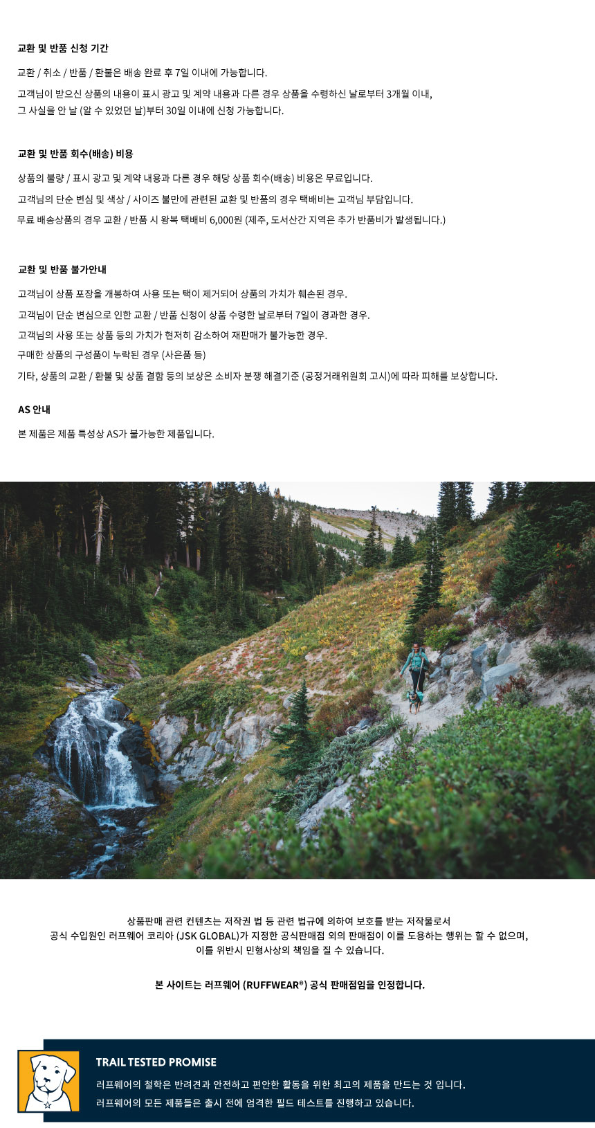 러프웨어(RUFFWEAR)는 그 이름만으로도 애견용품을 대표하는 최고급 브랜드로 미국 오리건주 밴드에 위치했습니다. 러프웨어의 철학은 개와 사람이 동료애를 느끼며 아웃도어 활동을 안전하고 편안하게 할 수 있는 최고급 아웃도어 애견용품을 만드는 것이며, 이를 위해 제품의 디자인, 소재를 그 목적에 맞게 설계/제작하고 있으며 지속적인 제품 개발을 통해 최고의 애견용품 업체로의 위상을 굳건해 하고 있습니다.