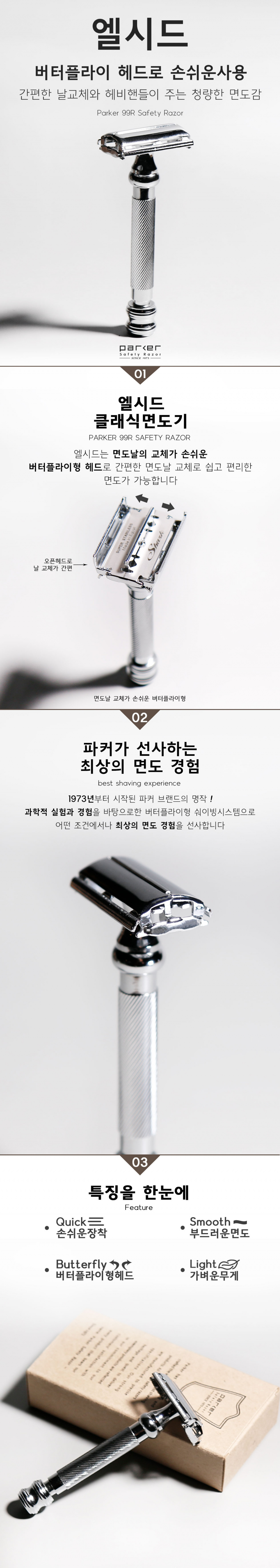 파커(PARKER)는 1973년부터 현재까지 반세기 넘게 프리미엄 클래식 면도기의 명성을 지켜온 브랜드입니다. 파커의 안전면도기 상품은 수작업으로 생산되어 클래식 면도기의 가치를 높이며, 광범위한 엔지니어링 및 품질 테스트 과정을 거칩니다. 고객의 니즈를 최우선시하는 파커의 혁신성과 우수성은 높은 평가를 받고 있습니다.