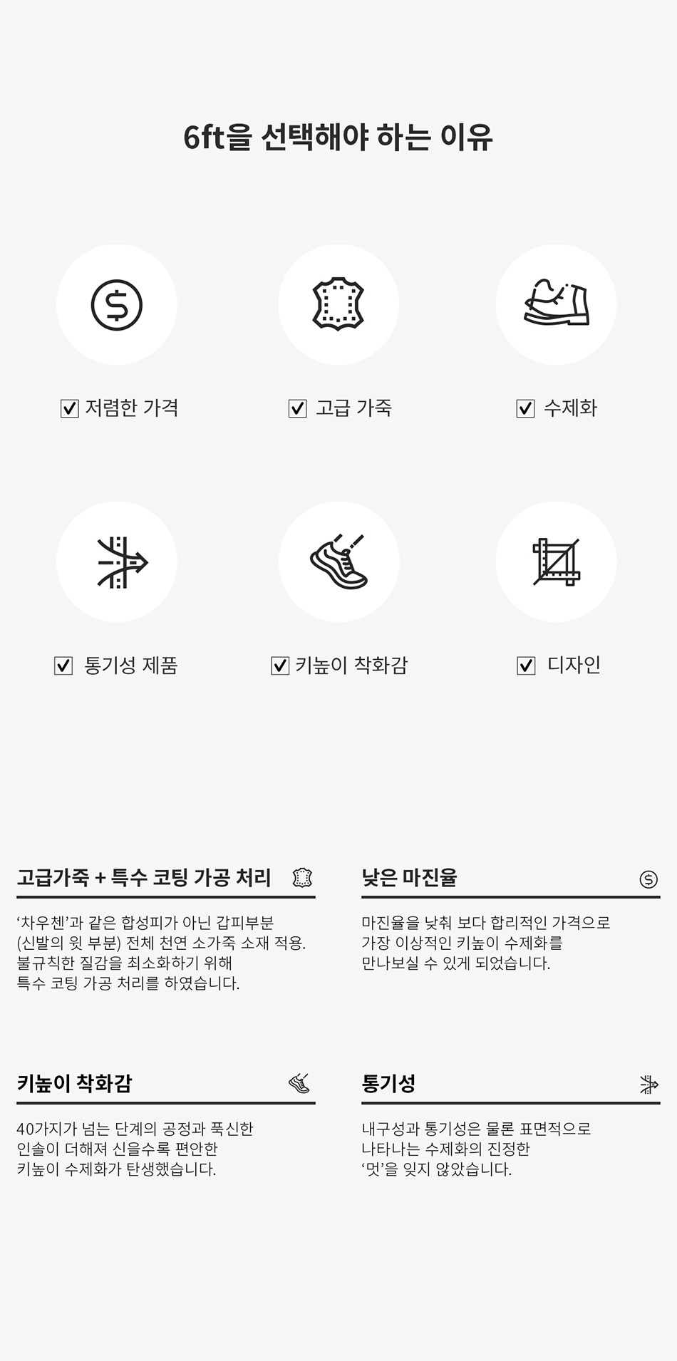 식스핏(6FT)은 스파 수제화의 새로운 기준점을 제시하는 브랜드입니다. 가성비의 진정한 의미를 선보이고 있습니다.
