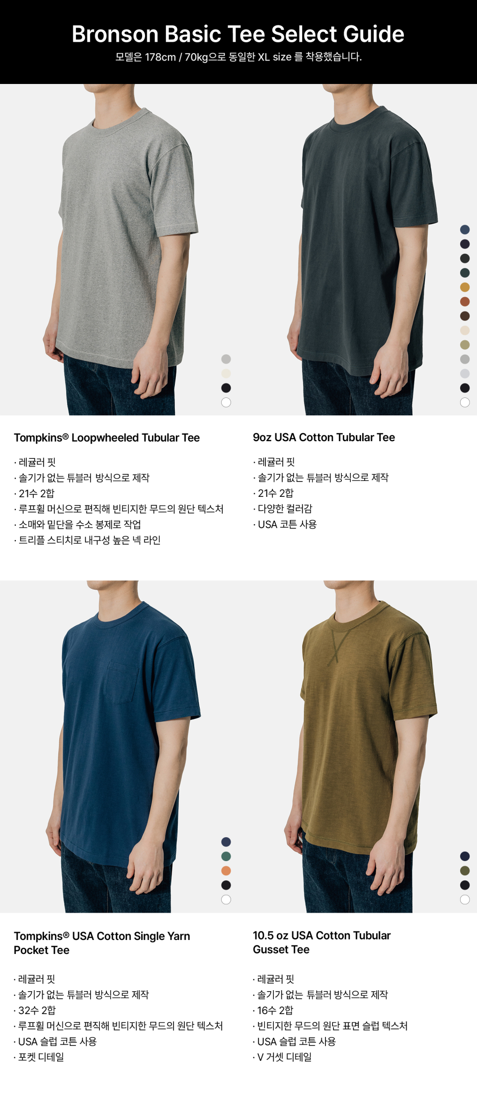 브론슨(BRONSON)은 오랜 의복을 토대로 모던한 요소를 더해 완성하는 정통 캐주얼 웨어를 추구합니다. 밀리터리, 아웃도어, 워크웨어, 빈티지 스포츠웨어 등 1970~1980년의 아메리칸 클래식에서 영감을 얻어 데님, 밀리터리, 캐주얼 등 폭 넓은 라인업을 전개하고 있습니다. 특히 기본에 충실하며 오랜 시간이 지나도 변함없이 함께할 수 있는 아이템을 생산합니다.