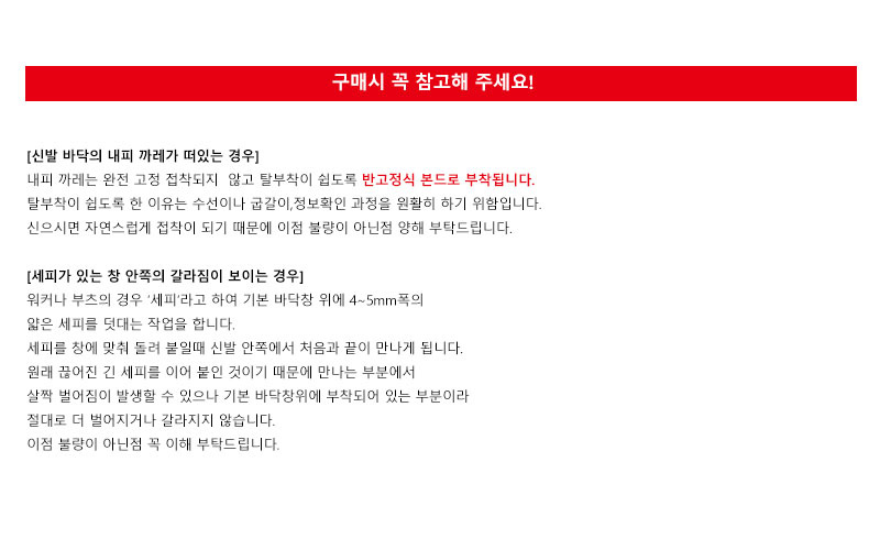 - 보다 만족스러운 피팅을 위해 주문 전 사이즈 문의를 권유해 드리며, 볼이 크거나 사이즈가 중간 사이즈이신 고객님들의 경우 주문시 상세히 기재해 주시거나