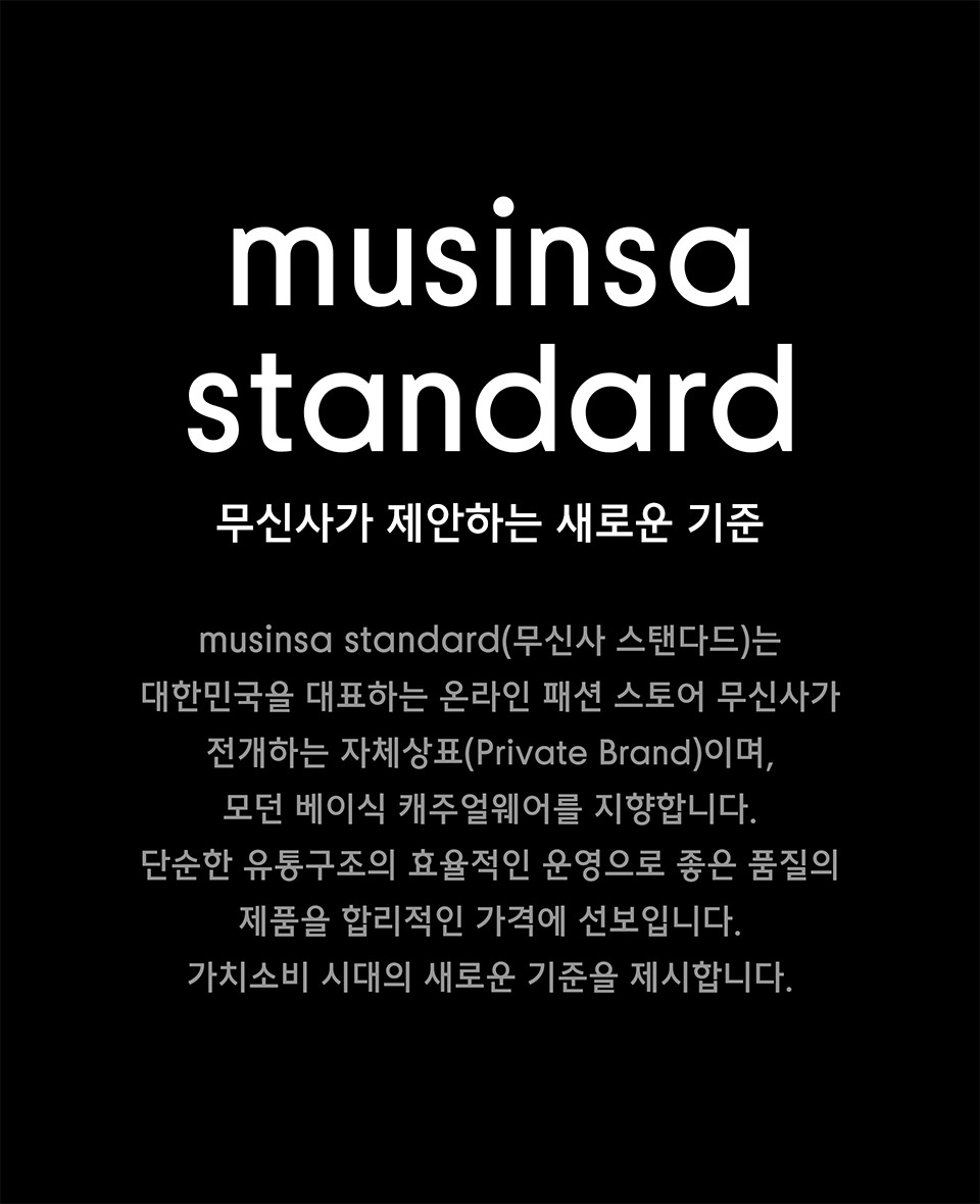 무신사 스탠다드(MUSINSA STANDARD)는 대한민국을 대표하는 온라인 패션 스토어 무신사가 전개하는 자체상표(Private Brand)이며, 모던 베이식 캐주얼웨어를 지향합니다. 단순한 유통구조의 효율적인 운영으로 좋은 품질의 제품을 합리적인 가격에 선보입니다. 가치소비 시대의 새로운 기준을 제시합니다.