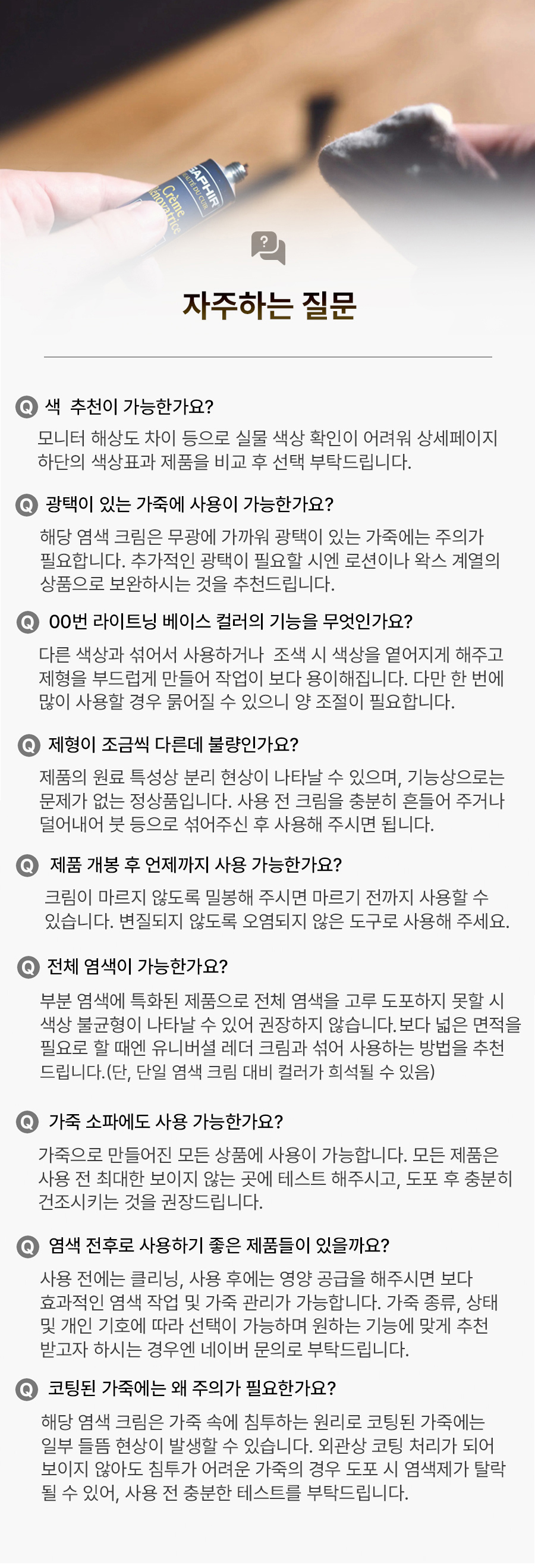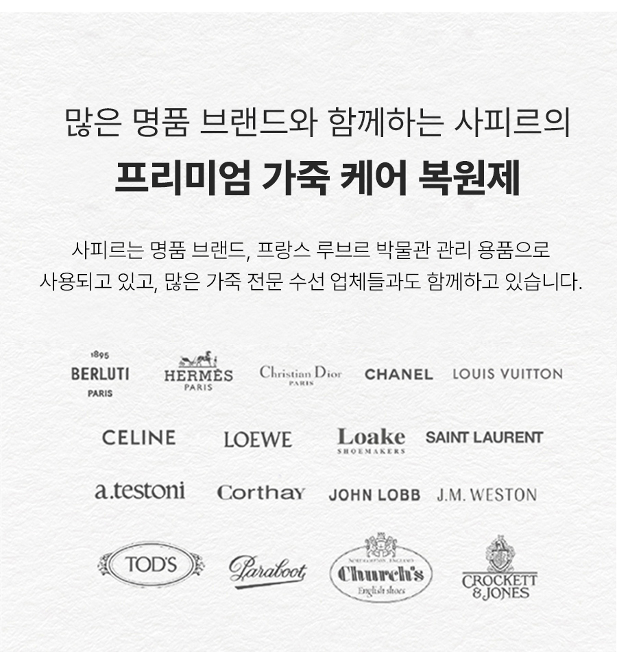 SAPHIR(사피르)는 1920년 프랑스 파리에서 설립된 프랑스를 대표하는 가죽케어 브랜드입니다. 꾸준한 연구와 최고의 재료의 결과로 가죽의 보존과 관리, 품질과 다양성으로 세계 여러나라로 수출하고 있습니다. 1925년 가죽제품의 장인정신을 오래 즐길 수 있도록 본래의 특성을 살린 케어제품 프리미엄라인을 출시하여 더욱 완벽한 제품을 선보이고 있습니다.