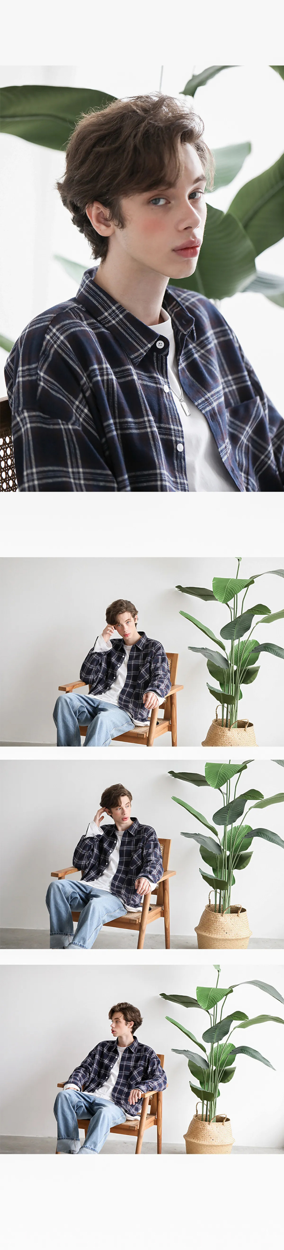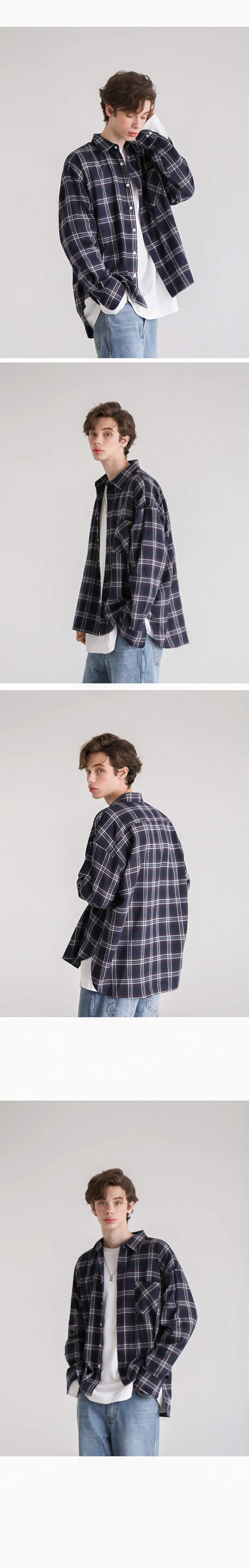 유니섹스 베이스 오버핏 체크셔츠-네이비