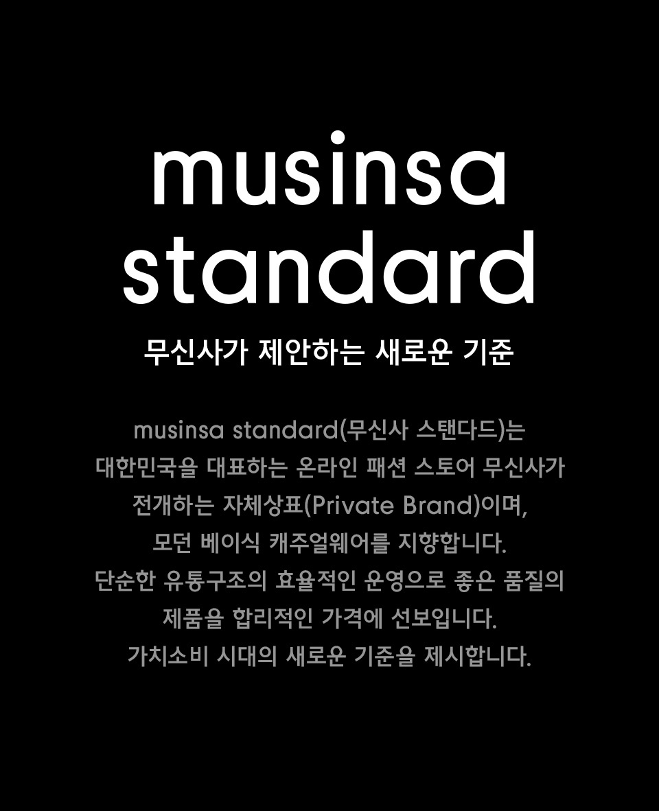 무신사 스탠다드(MUSINSA STANDARD)는 대한민국을 대표하는 온라인 패션 스토어 무신사가 전개하는 자체상표(Private Brand)이며, 모던 베이식 캐주얼웨어를 지향합니다. 단순한 유통구조의 효율적인 운영으로 좋은 품질의 제품을 합리적인 가격에 선보입니다. 가치소비 시대의 새로운 기준을 제시합니다.