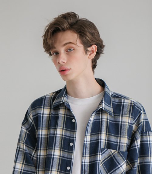 유니섹스 베이스 오버핏 체크셔츠-네이비