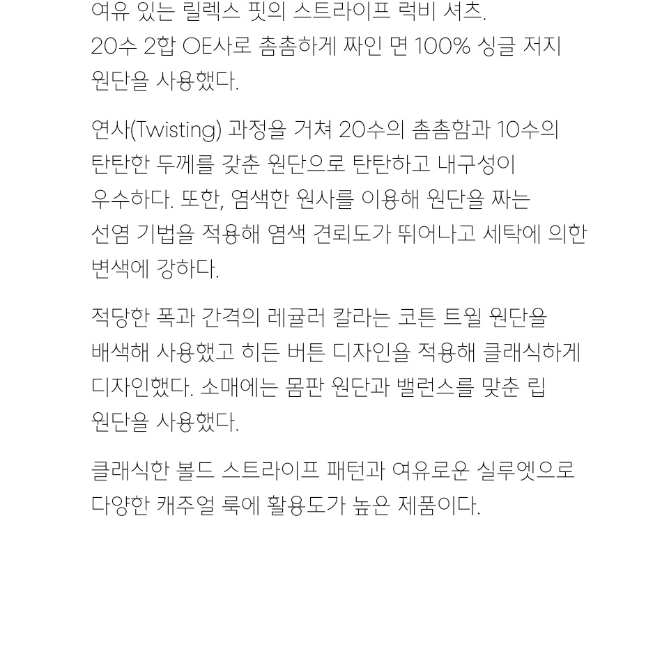 무신사 스탠다드(MUSINSA STANDARD)는 대한민국을 대표하는 온라인 패션 스토어 무신사가 전개하는 자체상표(Private Brand)이며, 모던 베이식 캐주얼웨어를 지향합니다. 단순한 유통구조의 효율적인 운영으로 좋은 품질의 제품을 합리적인 가격에 선보입니다. 가치소비 시대의 새로운 기준을 제시합니다.