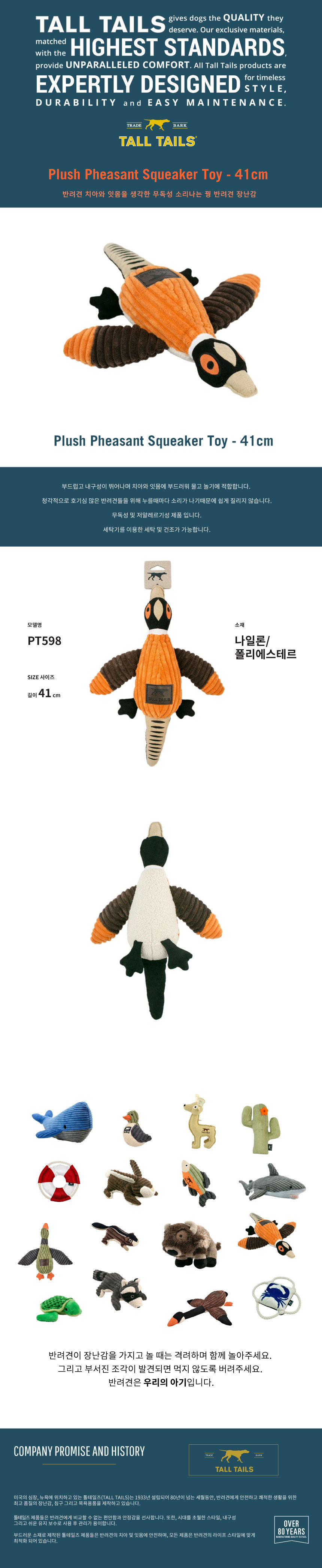 톨테일즈(TALLTAILS)는 1933년 론칭 이후 80년이 넘는 세월 동안 반려견에게 안전하고 쾌적한 생활을 위한 최고 품질의 장난감과 침구, 목욕용품을 제작하는 브랜드입니다. 톨테일즈의 상품들은 반려견에게 최고의 편안함과 안정감을 선사합니다. 또한 시대를 초월하는 스타일과 내구성, 쉬운 유지 및 보수 기능성 덕에 관리가 용이합니다. 모든 제품은 반려견의 라이프스타일에 최적화되어 있습니다.