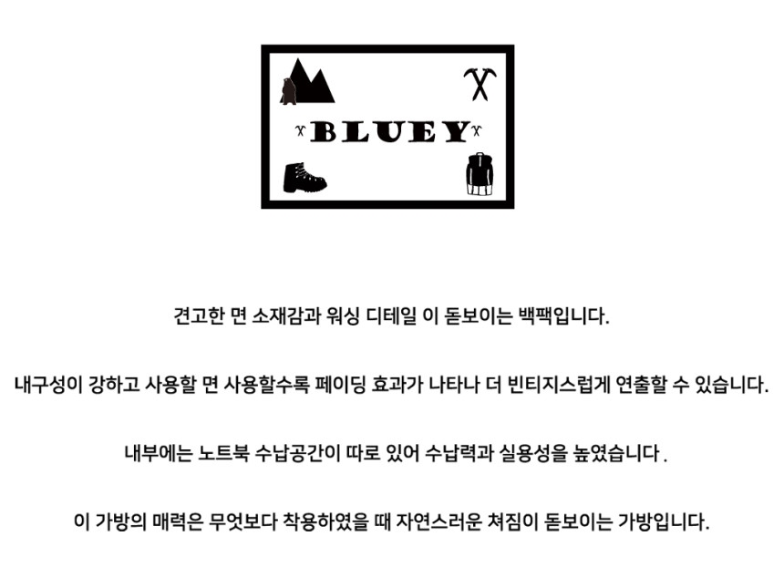 블루이는 일상생활에서 편하게 입을 수 있는 라이프 아웃도어 스타일을 지향하며 블루이만의 시각으로 만들어가는 가방 전문 브랜드 입니다.