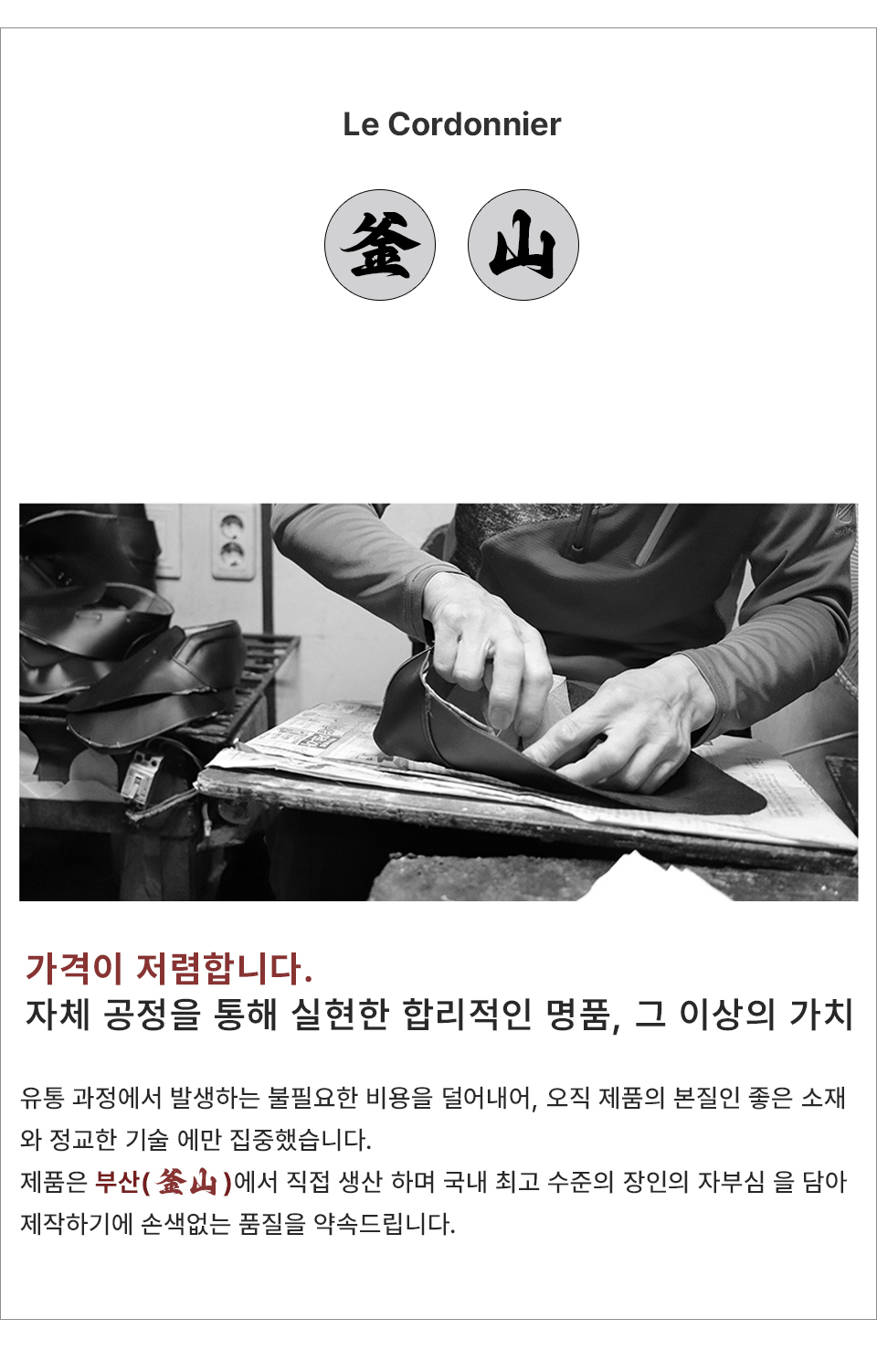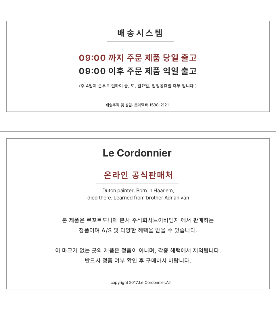 르꼬르도니에(LE CORDONNIER)는 네덜란드 화가 이삭 반 오스 타데(Izaack Van Ostade)의 작품 '구두 수선공'을 의미합니다. 네덜란드에서 구두 제작 유학을 마친 대표가 한국에서 합리적인 수제화 제작, 유통이라는 슬로건을 걸고 2013년에 론칭한 브랜드입니다.