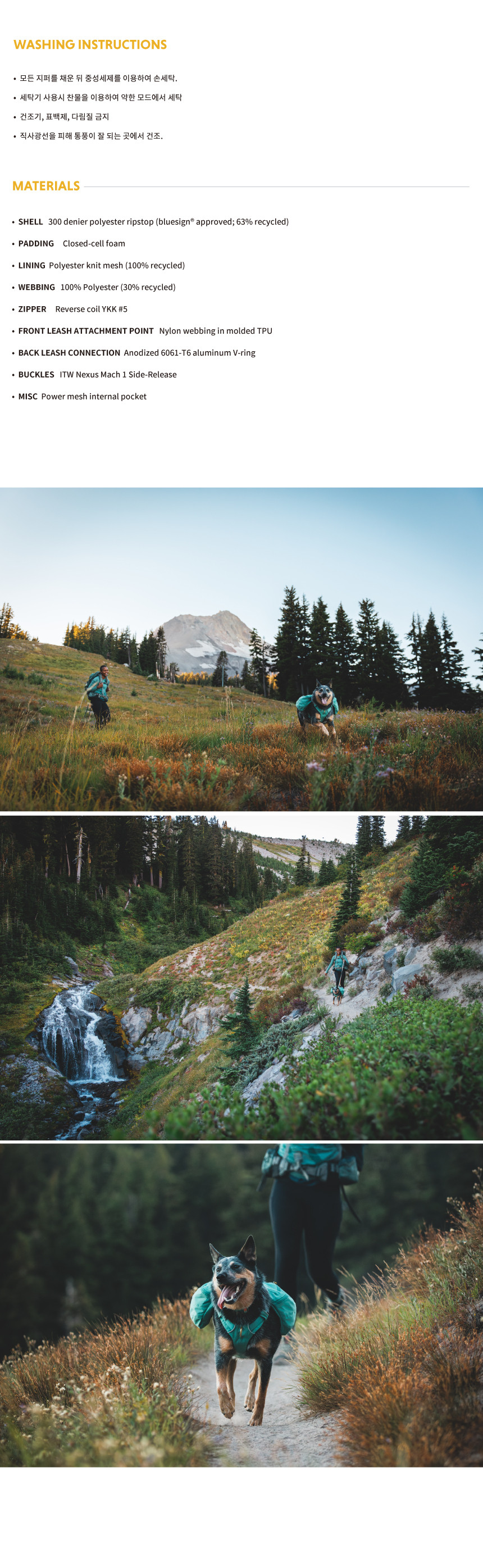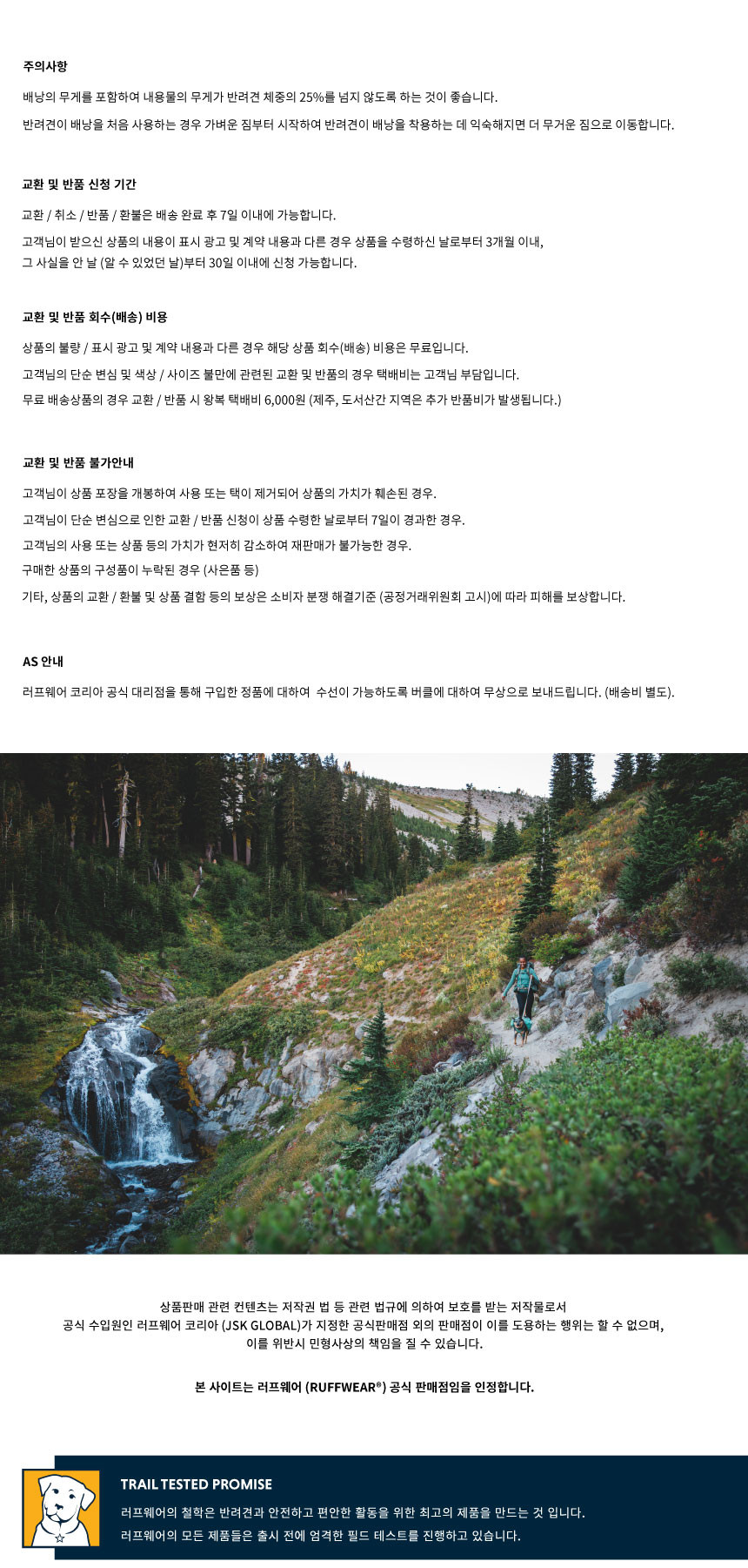 러프웨어(RUFFWEAR)는 그 이름만으로도 애견용품을 대표하는 최고급 브랜드로 미국 오리건주 밴드에 위치했습니다. 러프웨어의 철학은 개와 사람이 동료애를 느끼며 아웃도어 활동을 안전하고 편안하게 할 수 있는 최고급 아웃도어 애견용품을 만드는 것이며, 이를 위해 제품의 디자인, 소재를 그 목적에 맞게 설계/제작하고 있으며 지속적인 제품 개발을 통해 최고의 애견용품 업체로의 위상을 굳건해 하고 있습니다.