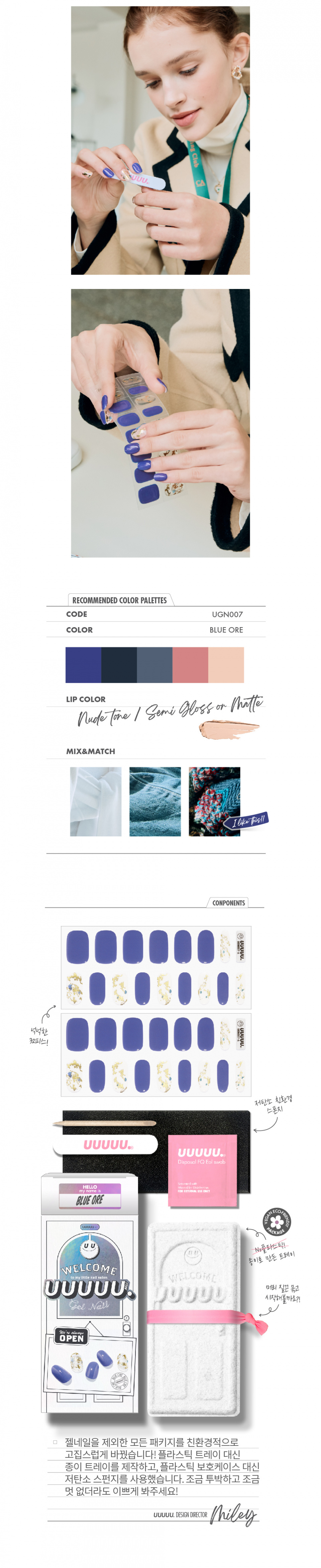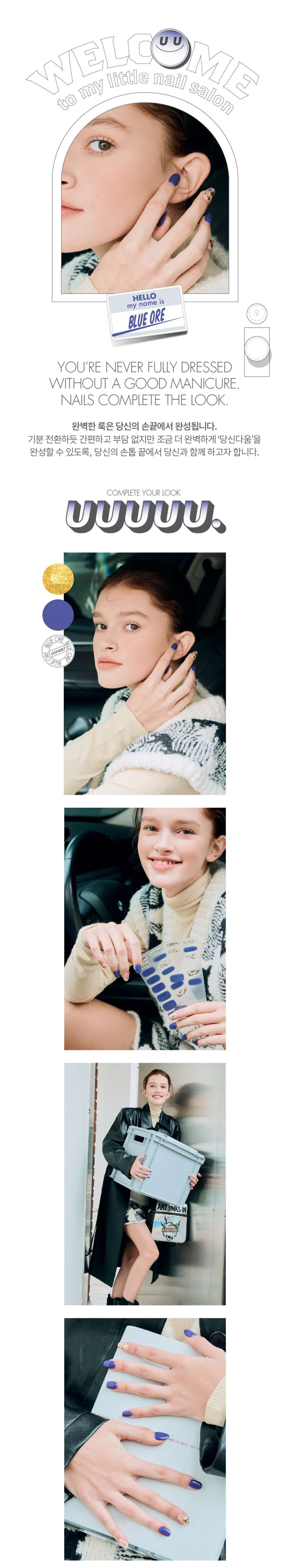 유유유유유(UUUUU.)는 'express U, for U, love U, with U UUUUU.'라는 슬로건 아래, 당신을 위한 쉽고 혁신적이며 감각적인 네일 제품을 선보이는 브랜드입니다.