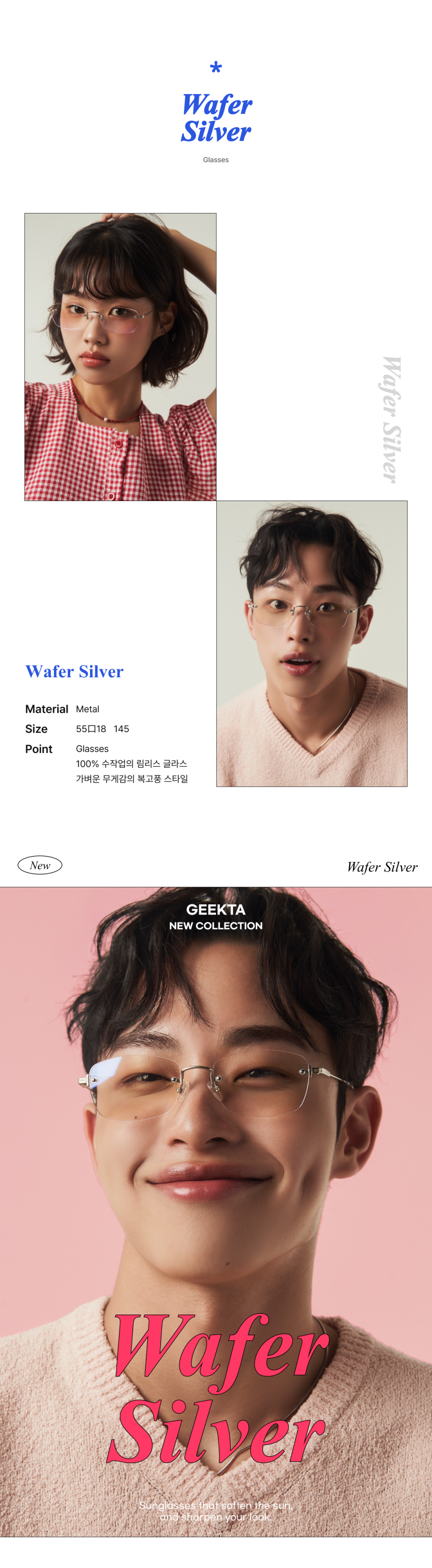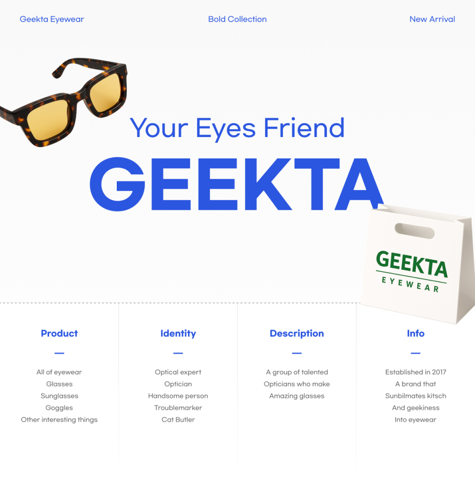 긱타아이웨어(GEEKTAEYEWEAR)는 '괴짜들이 만드는 진짜 안경'을 컨셉트로, 안경을 착용하는 사람의 아이덴티티를 제품에 담아냅니다. 긱타아이웨어만의 퍼포먼스로 특별하고 완전하도록 새로운 감각을 만드는 하우스 브랜드입니다.