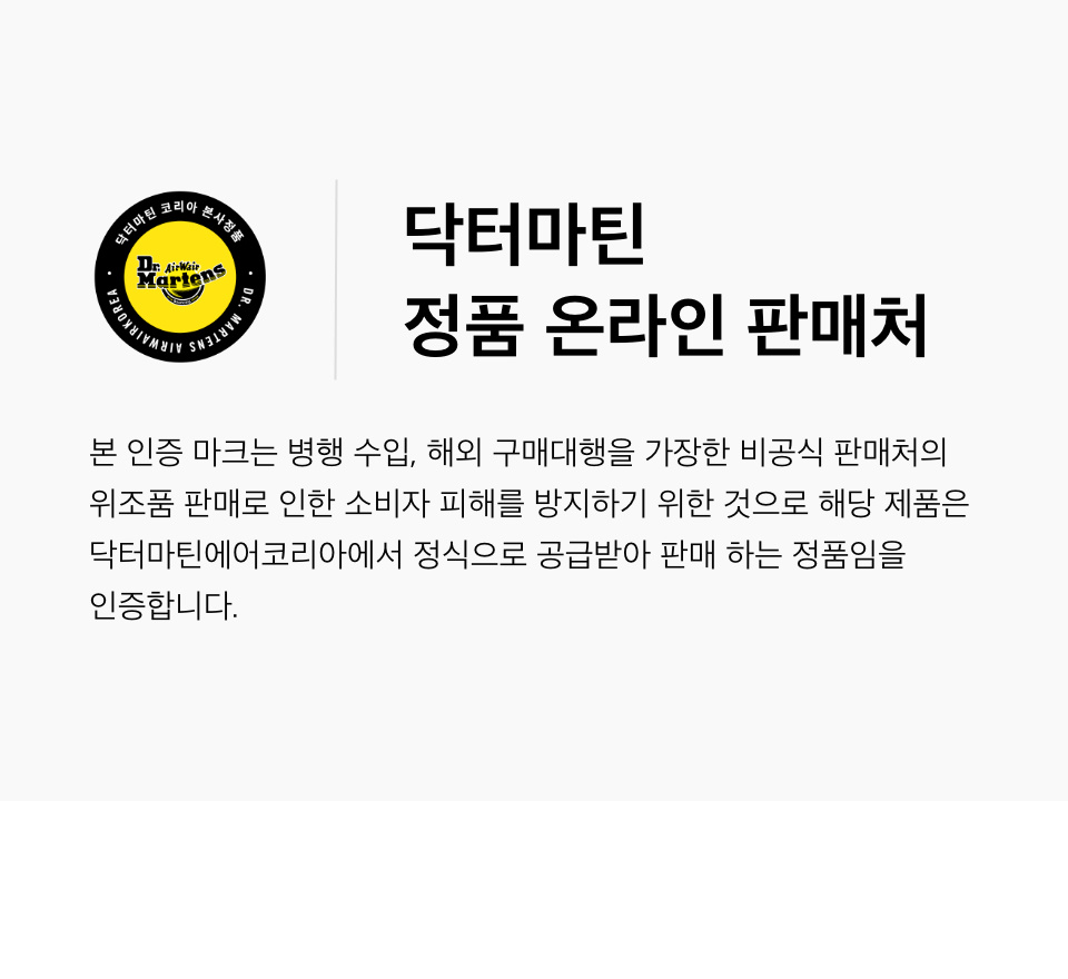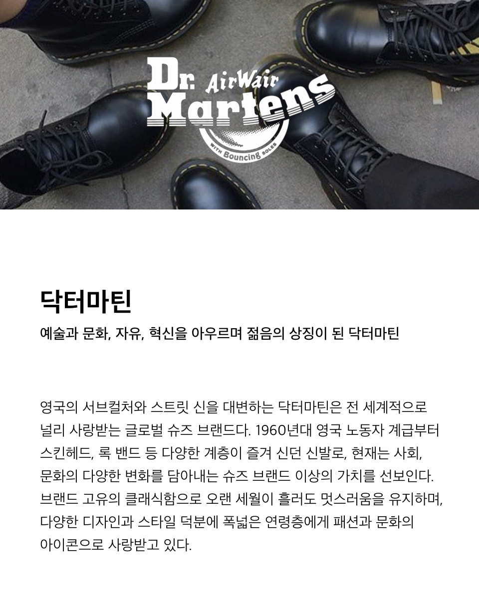 닥터마틴(DR.MARTENS)은 군인의 발을 편하게 만들기 위해 시작했지만 지금은 뮤지션, 패션피플, 모델 등의 사랑을 받는 상징적인 부츠 아이템으로 성장하며 한국뿐 아니라 전 세계에서 사랑을 받는 영국 브랜드로 자리매김을 했습니다. 편안한 착화감과 함께 다양한 스타일을 자랑하며, 신을 수록 자신의 개성과 스타일을 연출할 수 있게 돕는 독특한 매력도 함께 지니고 있습니다.