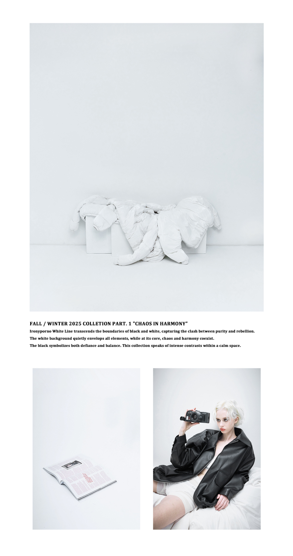 아이러니포르노 화이트라인(IRONYPORNO WHITELINE)은 기존의 오리지널 라인과 전혀 다른 새로운 모습으로 선보이는 브랜드입니다. 약간의 키치함과 세련미가 섞인 언밸런스한 느낌을 담고 있습니다.