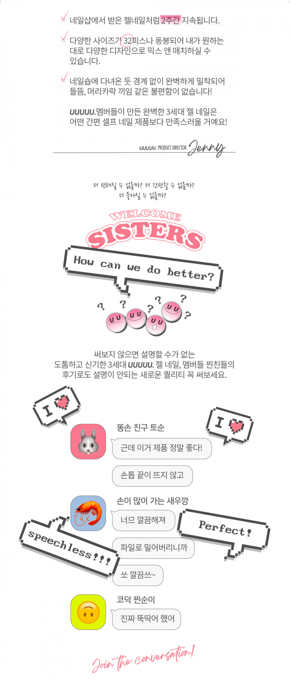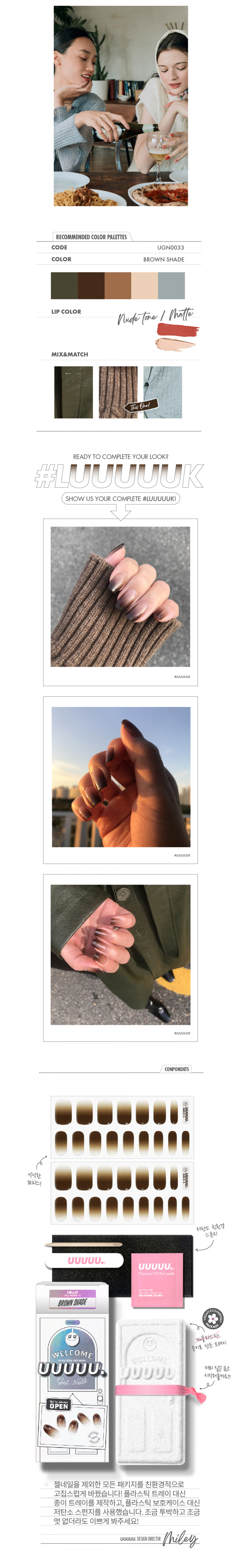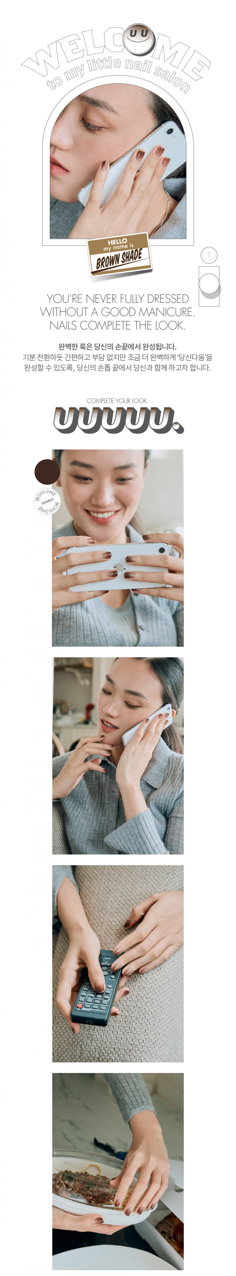 유유유유유(UUUUU.)는 'express U, for U, love U, with U UUUUU.'라는 슬로건 아래, 당신을 위한 쉽고 혁신적이며 감각적인 네일 제품을 선보이는 브랜드입니다.