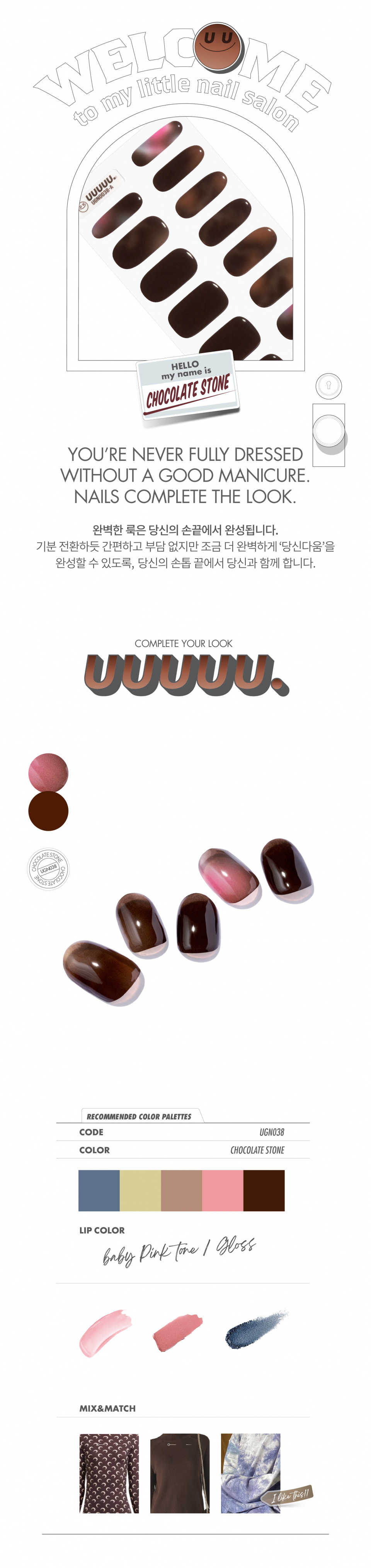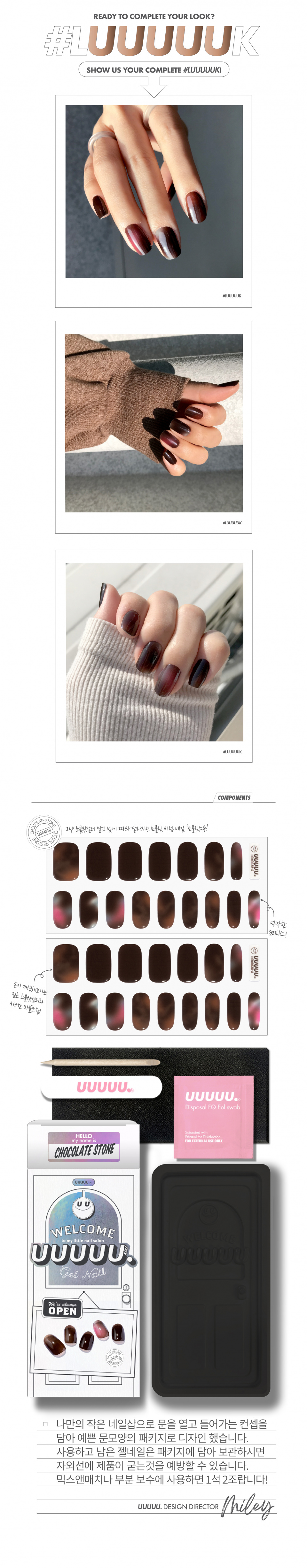 유유유유유(UUUUU.)는 'express U, for U, love U, with U UUUUU.'라는 슬로건 아래, 당신을 위한 쉽고 혁신적이며 감각적인 네일 제품을 선보이는 브랜드입니다.