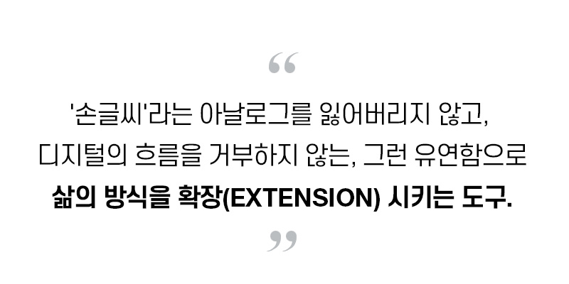 컨트롤 익스텐션은 우리의 삶 속에서 [아날로그와 디지털의 최적의 조합]을 이루어내고자 합니다. 정보를 메모하고, 아이디어를 스케치하고, 일상을 기록하고, 저장하고 소통하는 근본은 동일하지만, 그것을 이루어내는 방식만이 달라졌을 뿐입니다 |