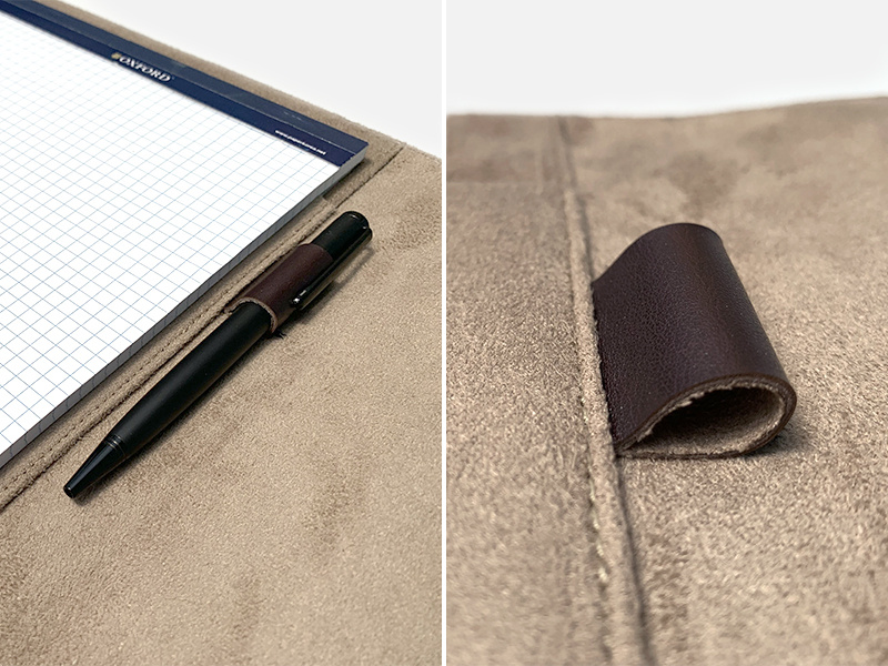 펜홀더 메모패드 포켓 바로 옆에 붙어있는 펜 홀더. 필기에 자주 사용하는 펜 하나를 소중하게 보관할 수 있습니다. |