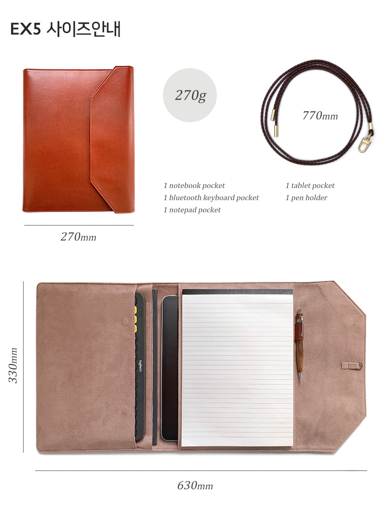 포켓1 수납가능 사이즈 : 290*130*10mm / 포켓2 수납가능 사이즈 : 가로210*세로297*두께10mm |
