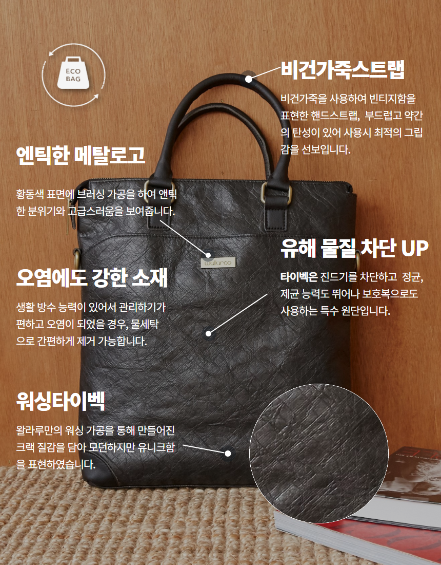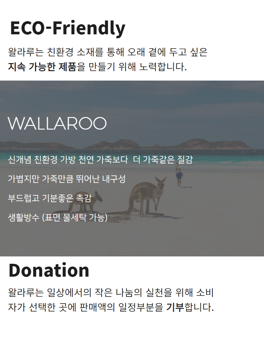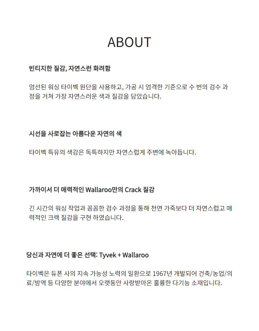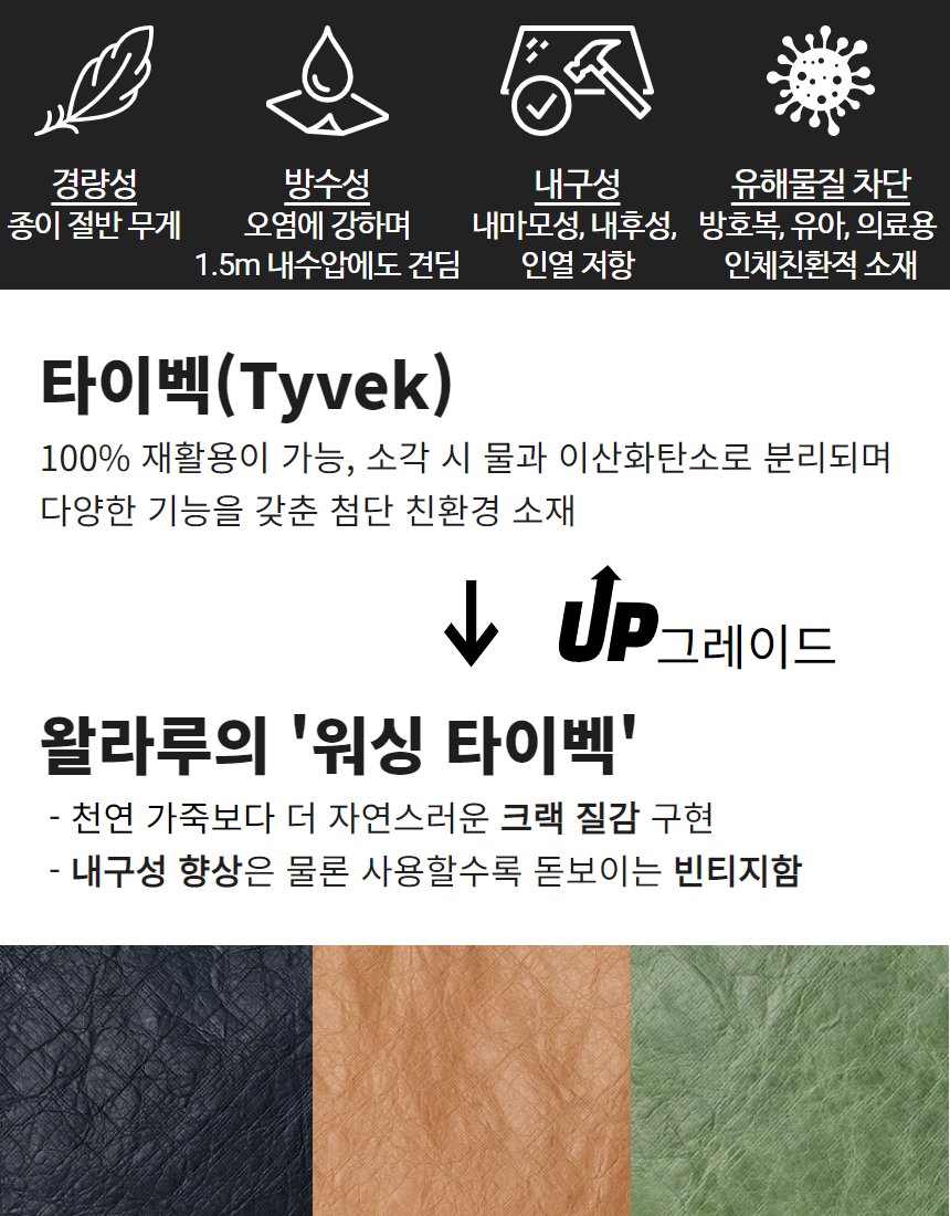 왈라루(WALLAROO)는 친환경 소재인 타이벡을 워싱 가공하여 새롭고 매력적인 질감과 색상을 구현한 친환경 프리미엄 브랜드입니다.