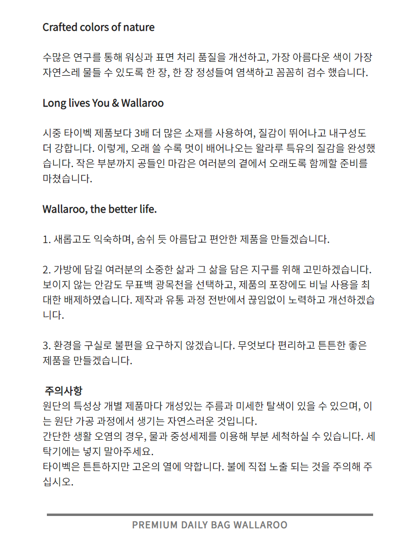 왈라루(WALLAROO)는 친환경 소재인 타이벡을 워싱 가공하여 새롭고 매력적인 질감과 색상을 구현한 친환경 프리미엄 브랜드입니다.
