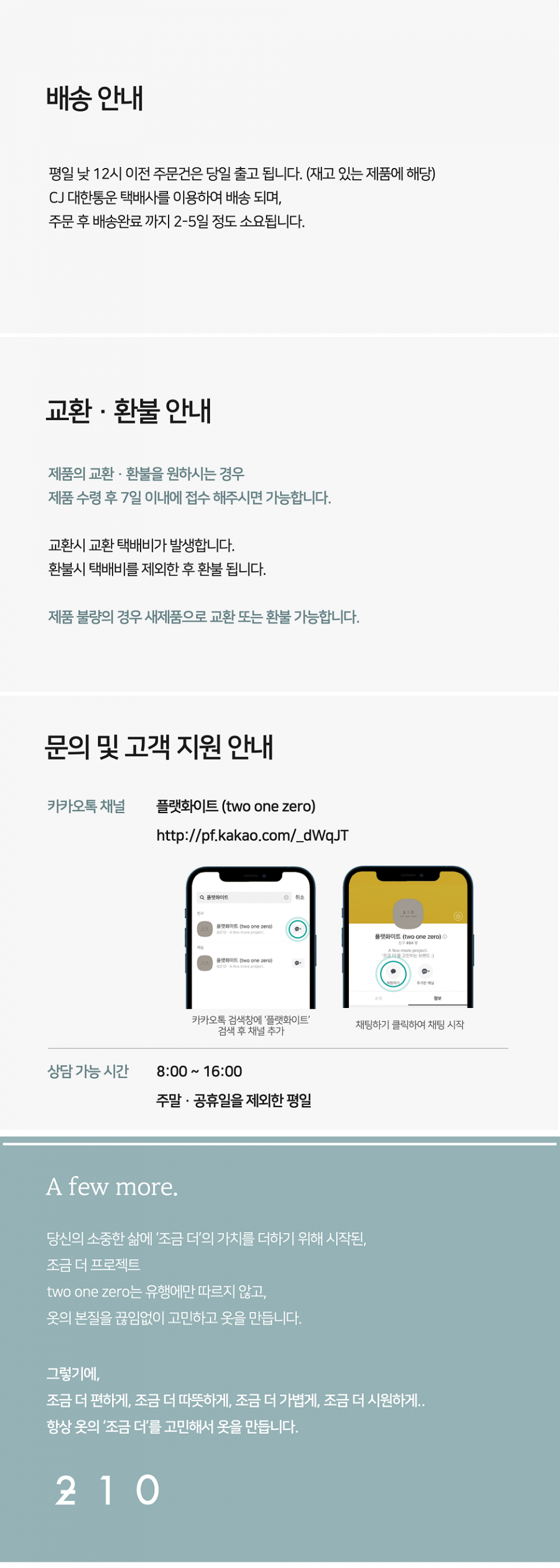 210(210EDIT)은 'A few more project'를 모티브로 '조금 더'를 고민하는 브랜드입니다. 모두가 만족할 수 있는 옷을 만들기 위해 연구합니다.