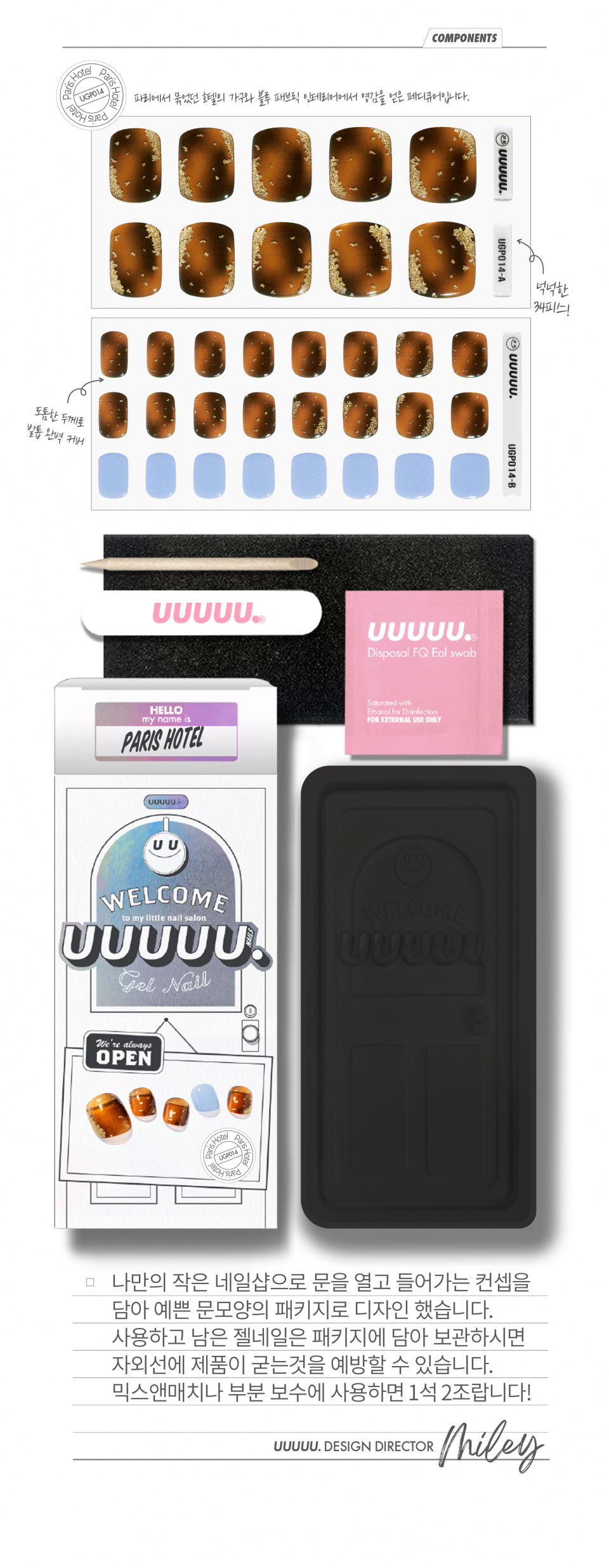 유유유유유(UUUUU.)는 'express U, for U, love U, with U UUUUU.'라는 슬로건 아래, 당신을 위한 쉽고 혁신적이며 감각적인 네일 제품을 선보이는 브랜드입니다.