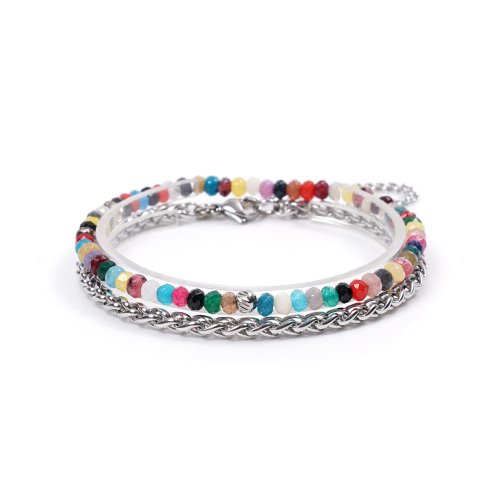 - 스네이크패턴의 체인을 이용해 제작한 써지컬스틸 팔찌와 컷팅 가공된 색색의 마노석을 사용해 제작된 원석팔찌로 이루어진 팔찌세트입니다.