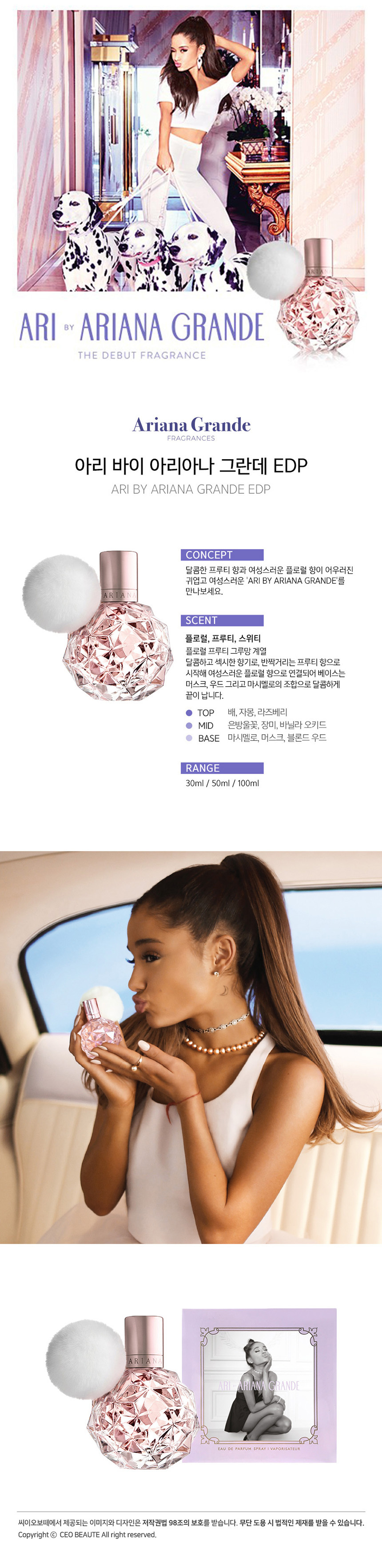 아리아나 그란데(ARIANA GRANDE)는 파워풀한 목소리와 유니크한 스타일로 음악 산업을 장악한 멀티 플래티넘 싱어송라이터 아리아나 그란데(Ariana Grande)의 프래그런스 브랜드입니다. 젊고 당당하지만 따뜻한 사랑으로 전 세계 팬들과 소통하고 있습니다. 그녀의 아이덴티티를 고스란히 담아낸 프래그런스를 선사합니다.