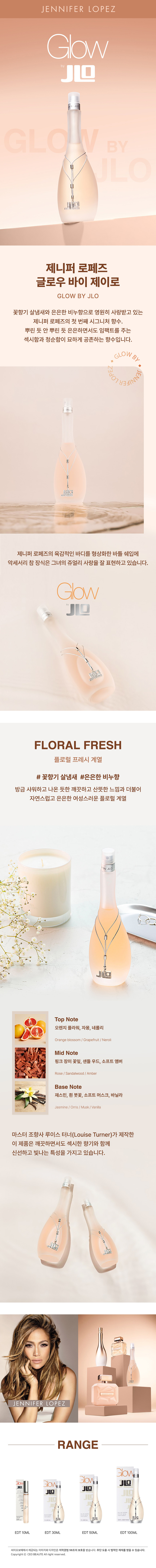 JENNIFER LOPEZ(제니퍼로페즈)는 대중적 인기와 개성, 빼어난 미모, 폭발적인 가창력과 연기력 등 J.LO 신드롬을 일으키며 모든 여성들이 갈망하는 글로벌 브랜드로. 유럽,일본,호주 등 아시아 지역에서 넘버 원 셀러로 자리잡았고, 독일,영국 등 유럽시장에서 탑5안에 랭크되어 있는 글로우 바이 제이로는 랑캐스터 향수 사업 부문 역사상 가장 큰 규모로 발매된 여성향수이자, 미국 향수 시장에서 가장 성공적인 발매를 기록했다는 평가를 받는 브랜드입니다.