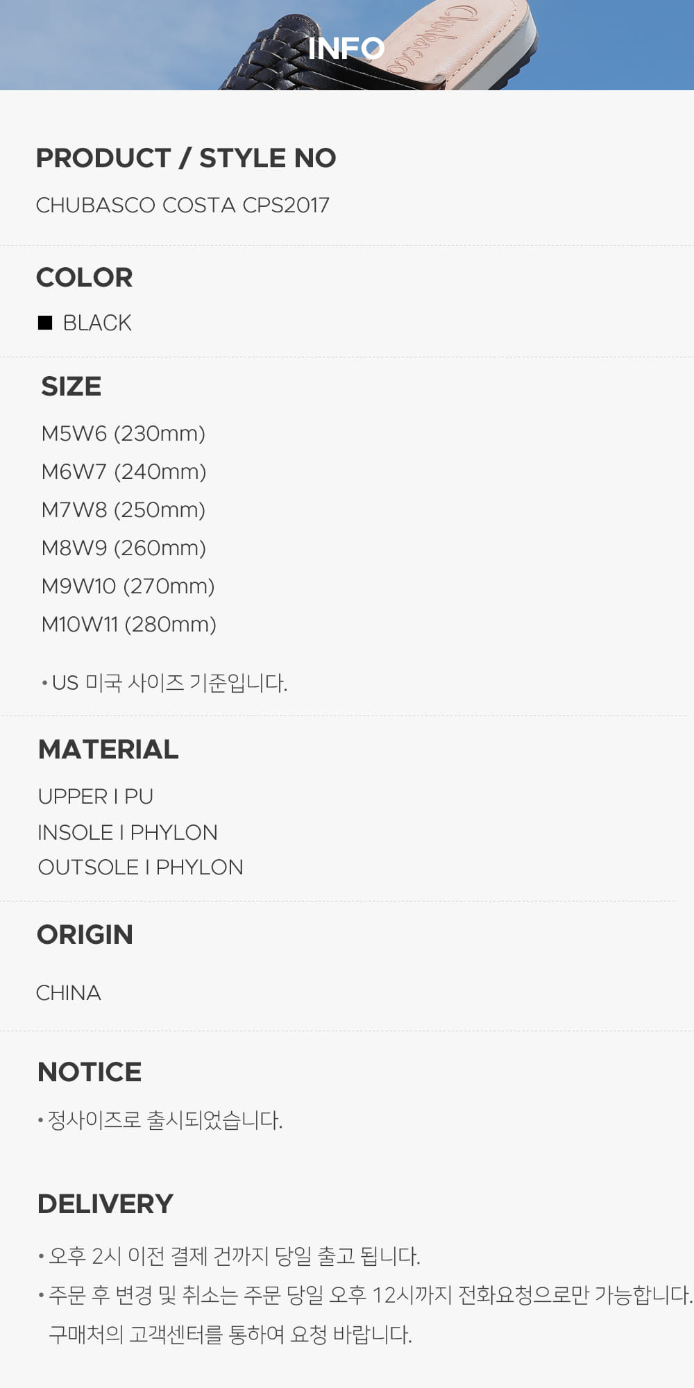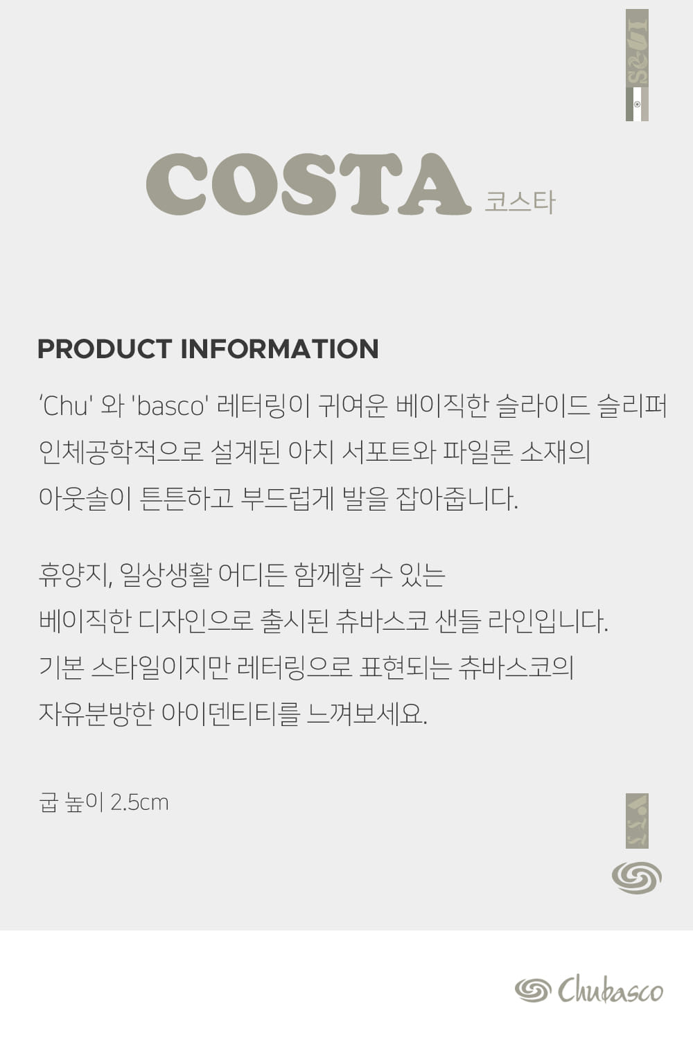 CHUBASCO(츄바스코)는 미국 샌디에이고에 본사를 둔 아웃 오더 슈즈 메이커입니다. 해안가 도시에서 캠핑과 서핑 등의 스포츠를 즐기며 자란 디자이너들에 의해 디자인되었습니다. 멕시코 전통신발인, 가죽을 땋아 만든 'Huarache'에서 영감을 얻어 나일론, 레더 위브, 소가죽 등의 현대 소재와 기술을 응용하여 편안함과 쾌적함을 제공합니다.