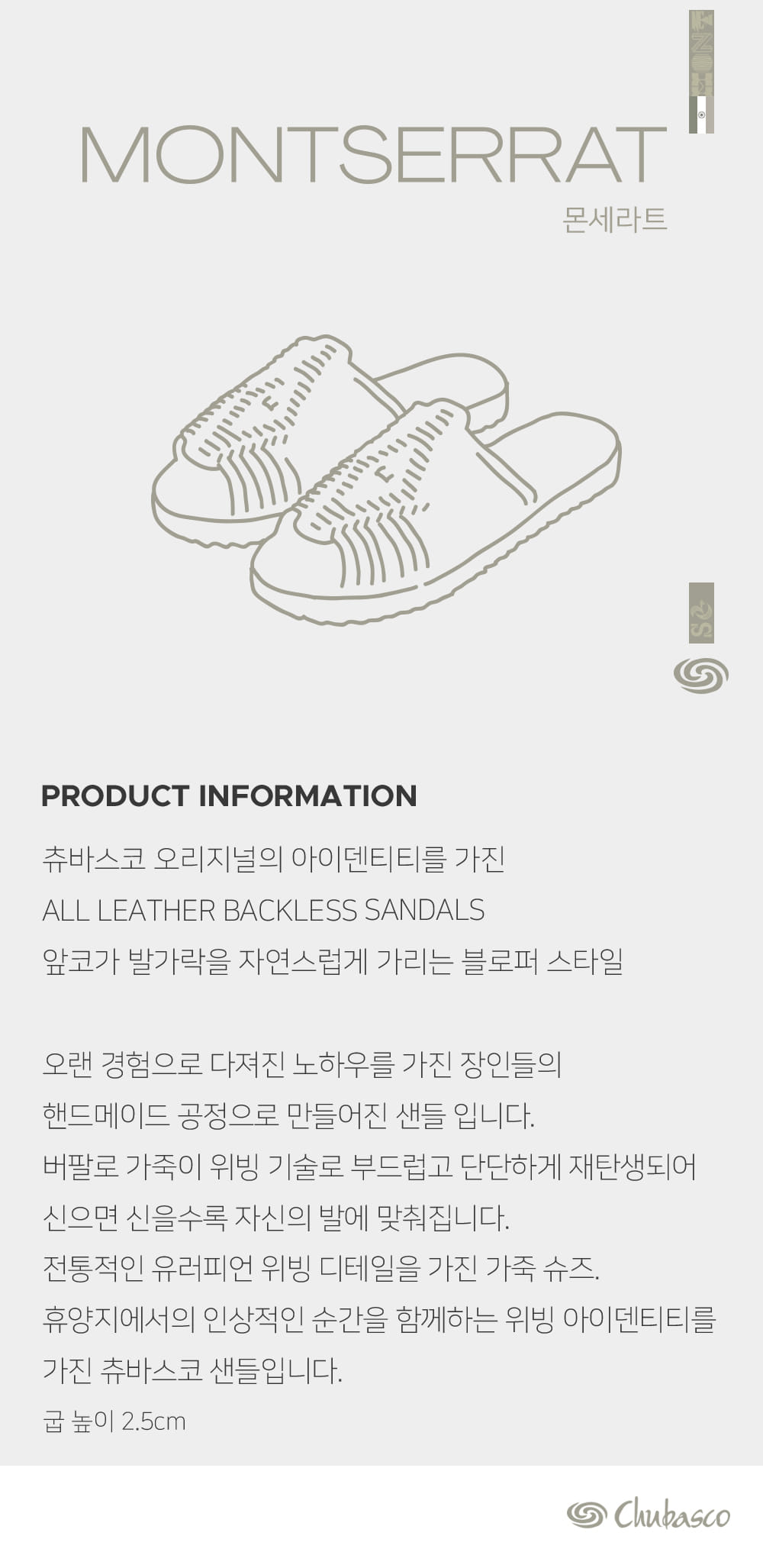 CHUBASCO(츄바스코)는 미국 샌디에이고에 본사를 둔 아웃 오더 슈즈 메이커입니다. 해안가 도시에서 캠핑과 서핑 등의 스포츠를 즐기며 자란 디자이너들에 의해 디자인되었습니다. 멕시코 전통신발인, 가죽을 땋아 만든 'Huarache'에서 영감을 얻어 나일론, 레더 위브, 소가죽 등의 현대 소재와 기술을 응용하여 편안함과 쾌적함을 제공합니다.