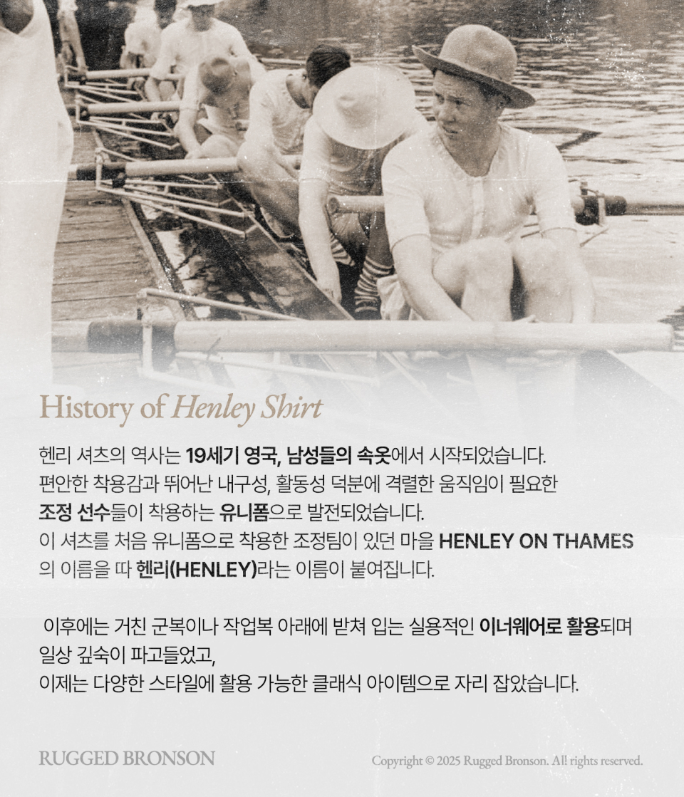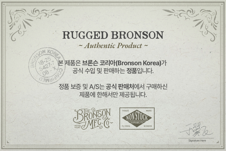 브론슨(BRONSON)은 오랜 의복을 토대로 모던한 요소를 더해 완성하는 정통 캐주얼 웨어를 추구합니다. 밀리터리, 아웃도어, 워크웨어, 빈티지 스포츠웨어 등 1970~1980년의 아메리칸 클래식에서 영감을 얻어 데님, 밀리터리, 캐주얼 등 폭 넓은 라인업을 전개하고 있습니다. 특히 기본에 충실하며 오랜 시간이 지나도 변함없이 함께할 수 있는 아이템을 생산합니다.