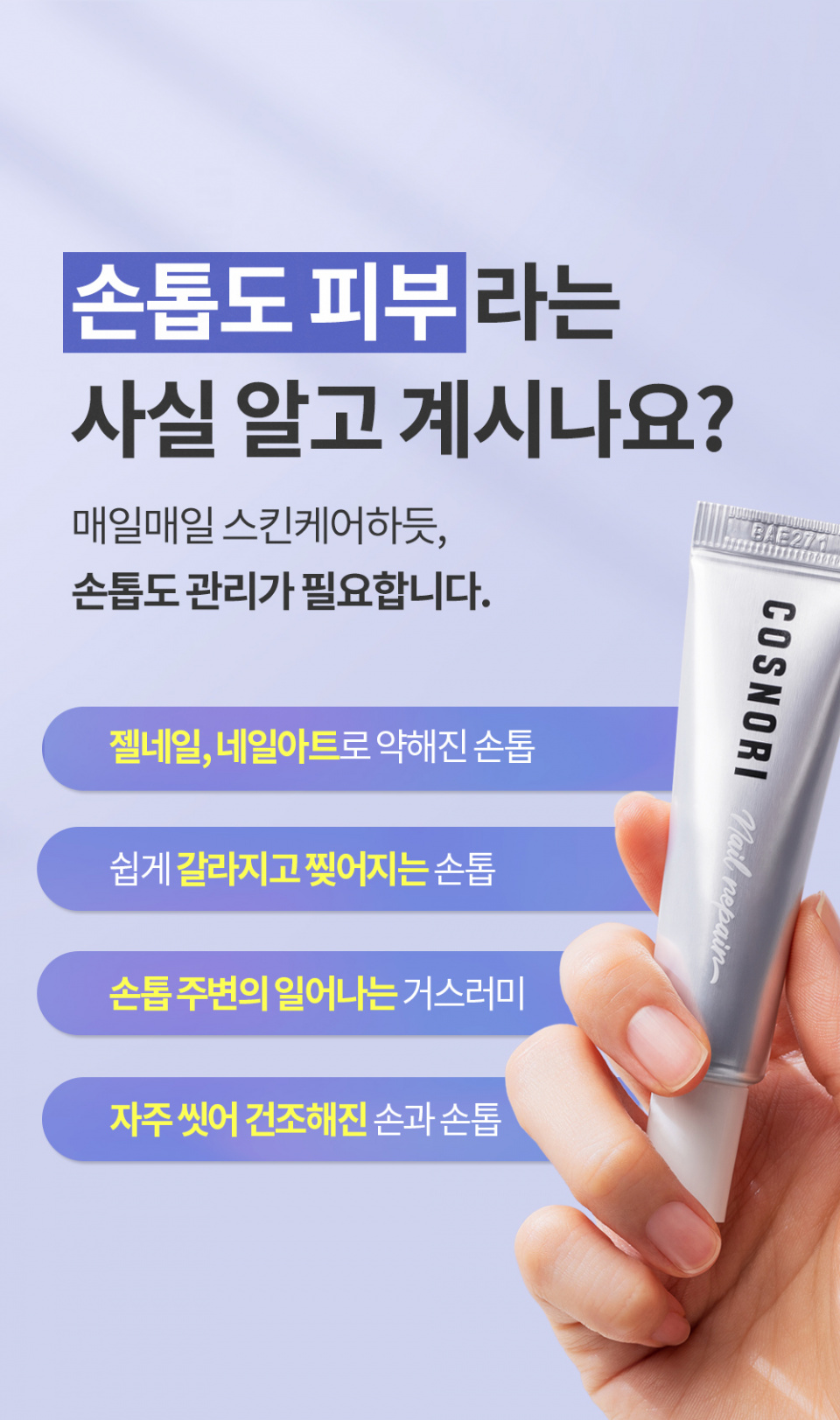 코스노리(COSNORI)는 현대인의 뷰티 고민을 함께하고 새로운 트렌드를 제시하며 뷰티&라이프스타일 리더로서 누구나 건강한 아름다움을 누릴 수 있기를 꿈꾸는 브랜드입니다.