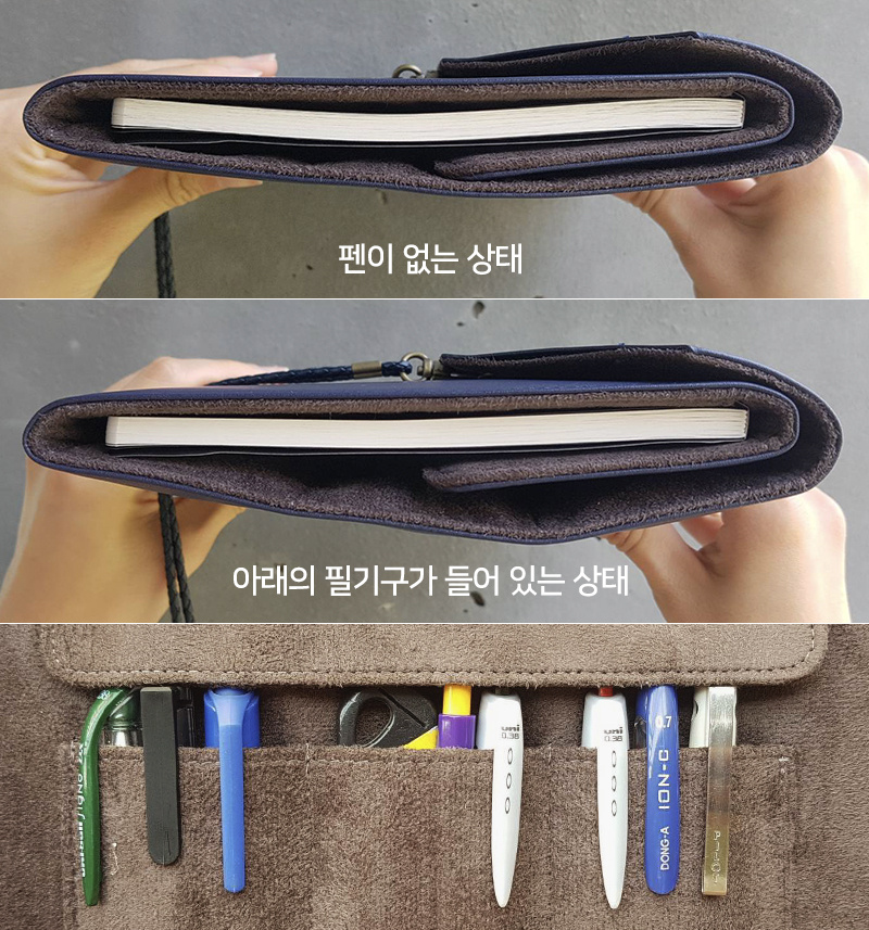 두꺼운 펜을 많이 넣거나 두꺼운 노트를 넣는 경우 외부 충격이 심하면 덮개가 열릴 수 있습니다.