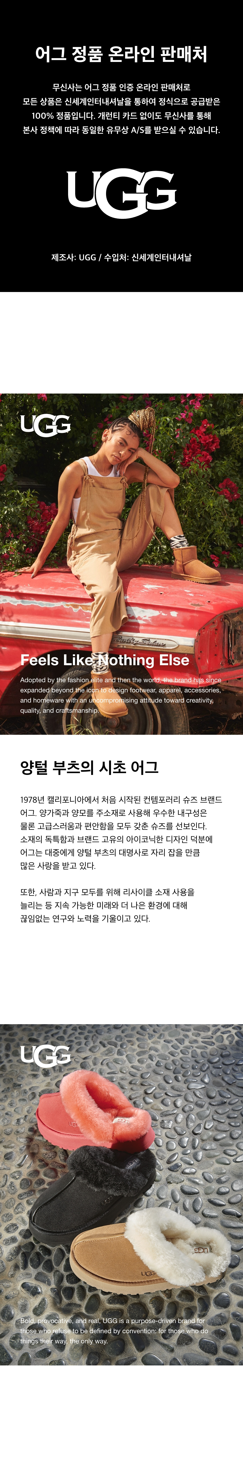 어그(UGG)는 캘리포니아 컨템포러리 라이프스타일 브랜드로 'Feels like nothing else'라는 브랜드 슬로건 아래, 어떤 것과도 비교할 수 없는 뛰어난 품질의 양가죽 슈즈를 선보이는 브랜드입니다. 현재는 슈즈뿐만 아니라 의류, 액세서리, 홈 제품까지 상품군을 확장하여 글로벌 라이프스타일 브랜드로서의 입지를 굳히고 있습니다.