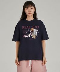 리얼주 플라워 포메 라운드 넥 15수 면 반팔 티셔츠_네이비